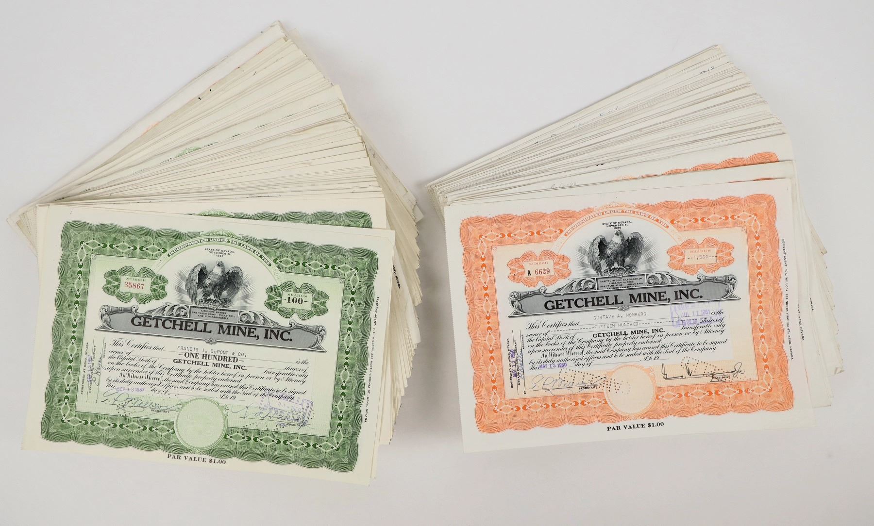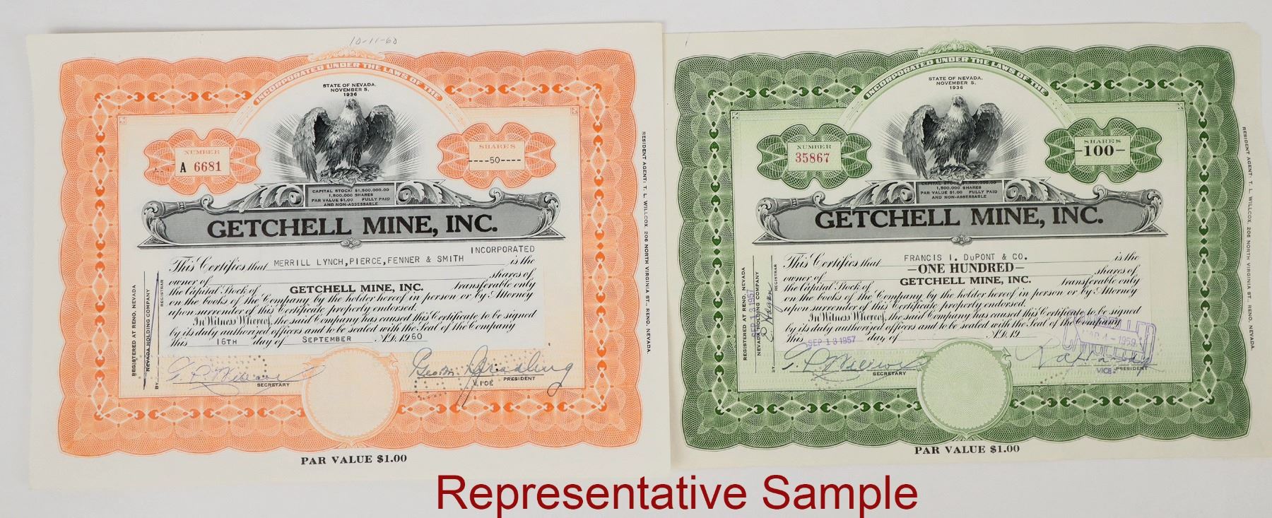 Over 200. . I/U, I/C. Issued 1950-60. Fine or better. Some have revenue stamps. Getchell Mine, Inc.. Two varieties, cancel by stamp. Located in Potosi Mining Dist., Humboldt County, Nevada. Signed by the following : Ray Hardy, George Wingfield Jr. and Spradling. Very rare.