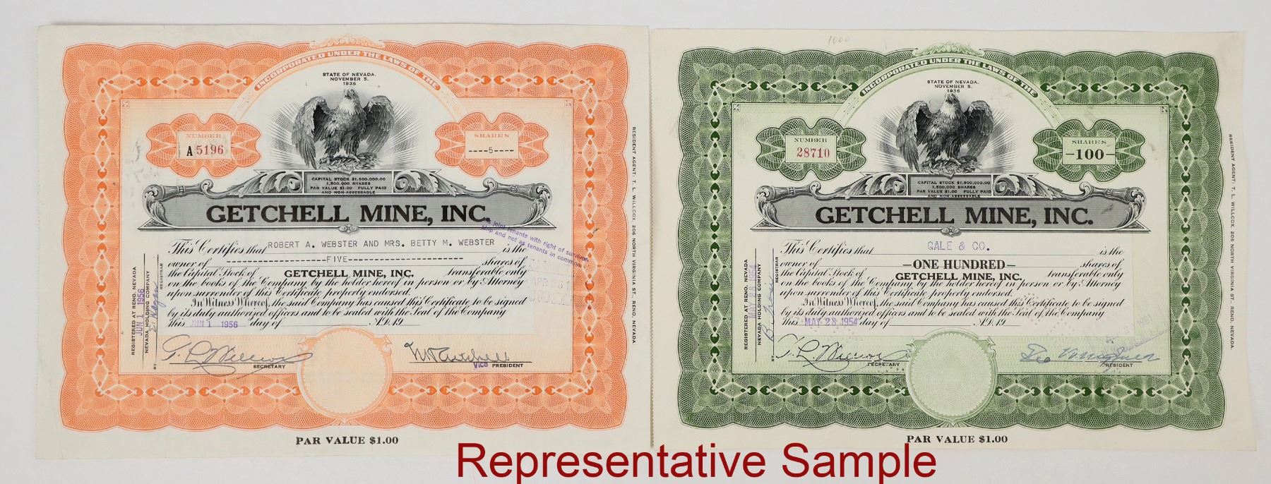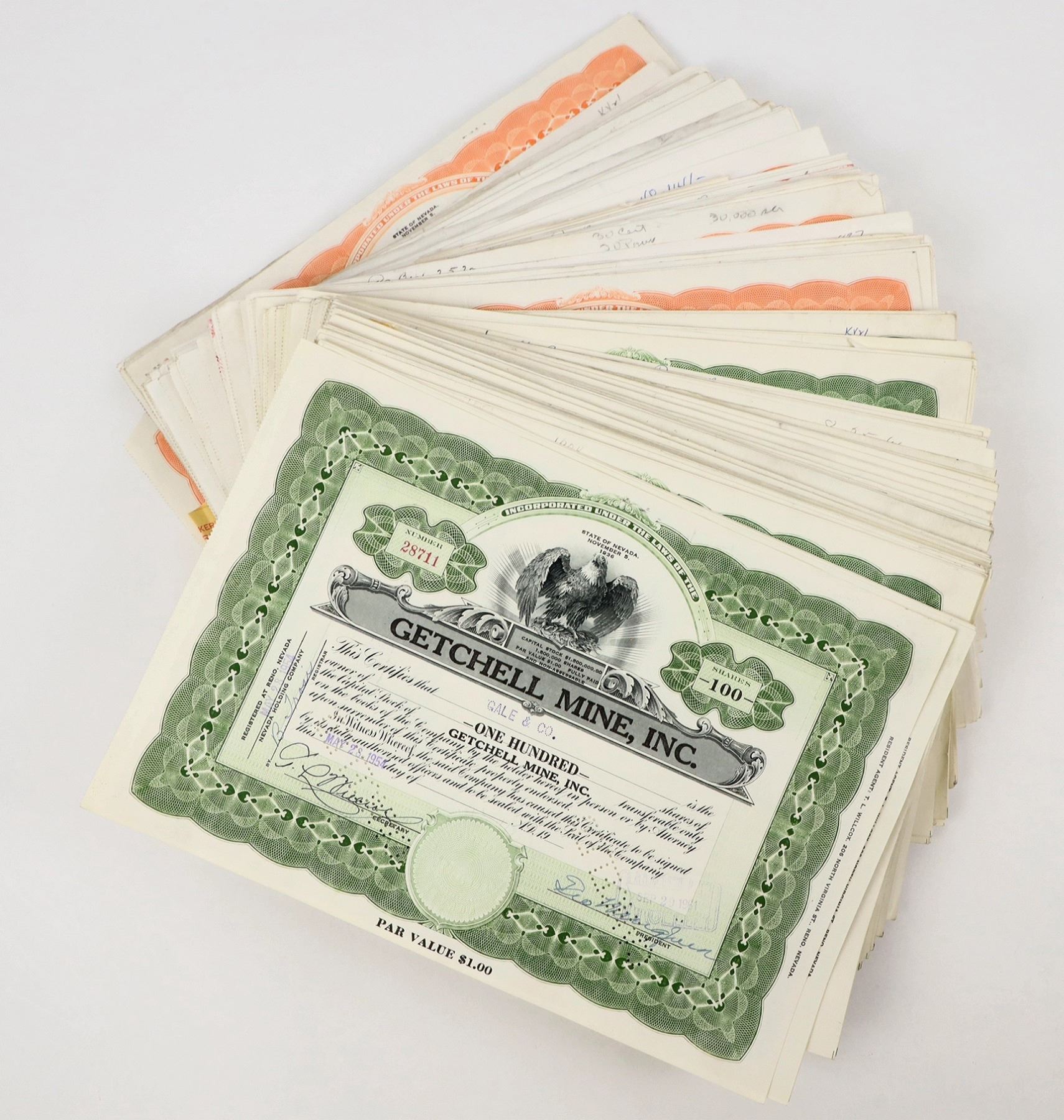 Over 200. . I/U, I/C. Issued 1950-60. Fine or better. Some have revenue stamps. Getchell Mine, Inc.. Two varieties, cancel by stamp. Located in Potosi Mining Dist., Humboldt County, Nevada. Signed by the following : George Wingfield president. Very rare.