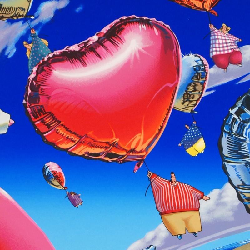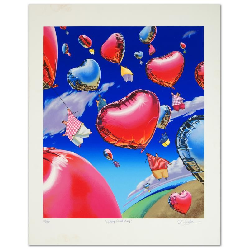 "Getting Carried Away" is a limited edition serigraph on paper, numbered and hand signed by Robert Barber! Measures approx. 29" x 38" (with border), 24" x 30" (image). ** Please note that there are smudge marks and minor discoloration around the border of this piece, this in no way affects the image itself. This artwork is being offered with this in mind. **