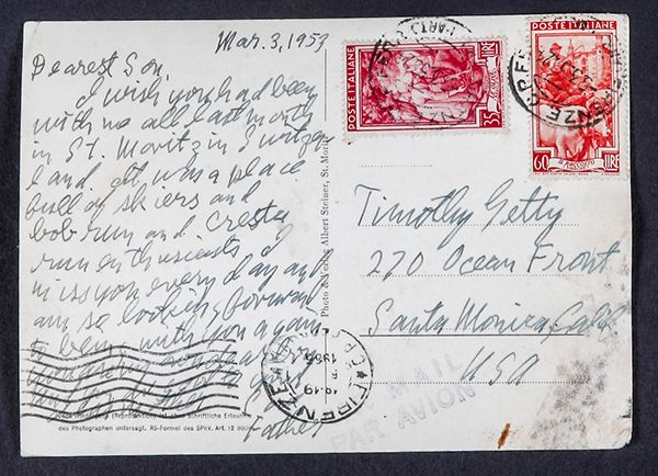 Getty, J. Paul (1892-1976) American industrialist, philanthropist and art collector. Rare autograph letter signed ("Father") on a postcard, postmarked from Florence, Italy, 3 Mar. 1953. Very good; dampstain in lower right corner; postmark affects the final sentence and closure. Written to Timothy Getty, his youngest son, by his fifth wife, Teddy. Getty writes: "Dearest Son, I wish you had been with us all last month in St. Moritz in Switzerland. It was a place full of skiers and bob run and Cresta run enthusiasts. I miss you every day and am so looking forward to being with you again. You are my own dear boy and you are good to your dear mother. Love, Father." Getty also addressed the postcard.
