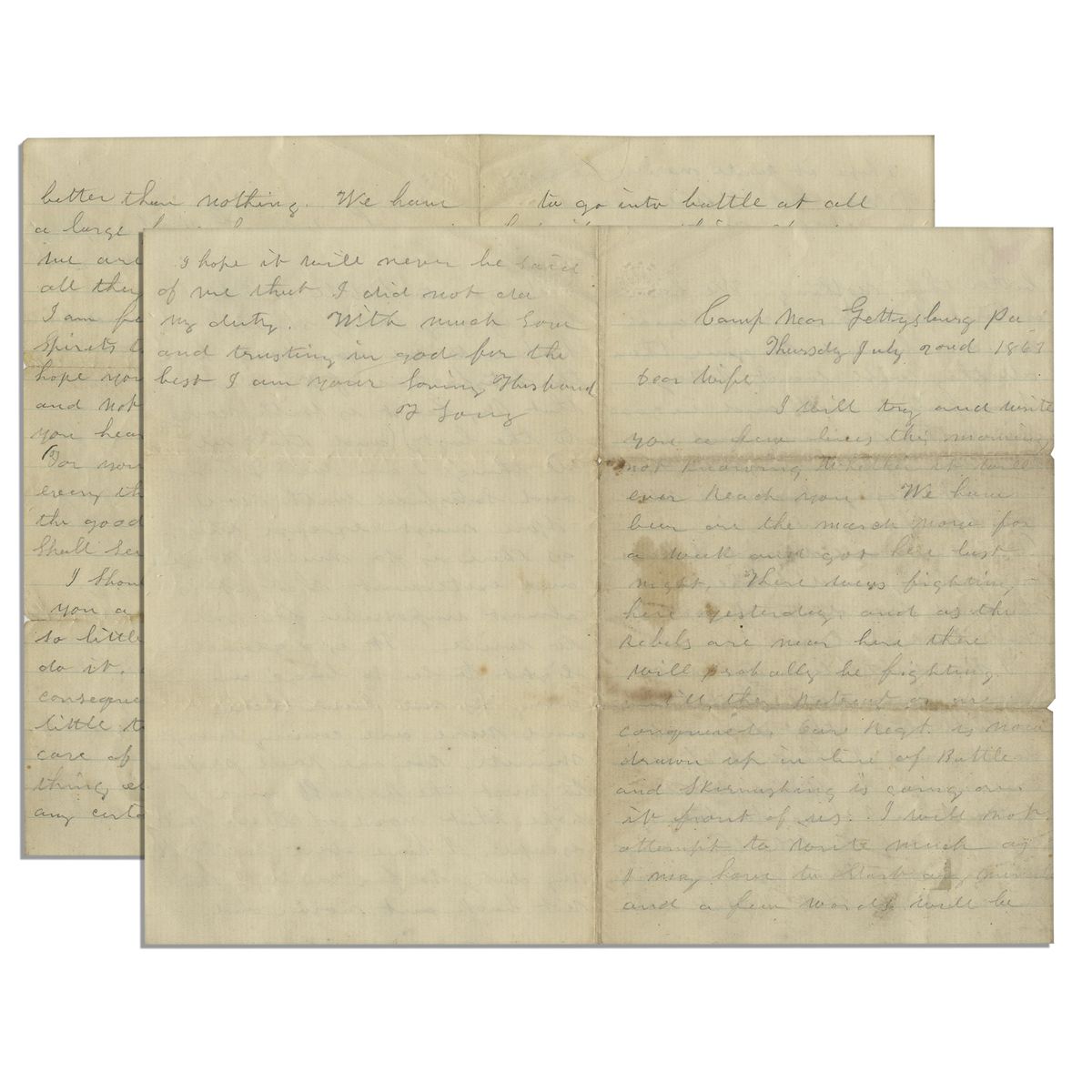 Autograph letter signed by Corp. Francis Long of the 16th Vermont Infantry, sent from a ''Camp near Gettysburg Pa'', dated Thursday July 2nd 1863''. Long's letter reads in full, ''Dear Wife, I will try and write you a few lines this morning not knowing whether it will ever reach you. We have been on the march now for a week and got here last night. There was fighting here yesterday and as the Rebels are near here there will probably be fighting untill they retreat or are conquered. Our Regt is now drawn up in line of Battle and skirmishing is going on in front of us. I will not attempt to write much as I may have to start any minute and a few words will be better than nothing. We have a large force here now and we are bound to give them all they will want today. I am feeling well and in good spirits this morning and I hope you will have good courage and not worry about me till you hear from me again. For now I will do and suffer everything, and I hope in the good providence of God I shall see you soon. I should be glad to write you a long letter, but I have so little time that I cannot do it and I think it of more consequence to spend what little time I have to taking care of my health than any thing else. There is by no means any certainty that I shall have to go into battle at all but if any thing should happen to me you will have the satisfaction of knowing that my heart is with you to the last and that in all things I am well pleased and satisfied with you. You must excuse this as there is so much noise and excitement that it is almost impossible for me to write. It is a grand sight to see so large an army as we have here and more are coming every minute. We are well prepared to meet the Rascals and I hope that none of them will escape. I have done faithfully my duty so far and I shall not back out now, and I hope it will never be said of me that I did not do my duty. With much love and trusting in god for the best I am your loving Husband F Long''. The 16th Vermont continued to Pickett's Charge the next day, on 3 July. Corp. Long survived and was mustered out in August. 4pp. letter on a single sheet of ruled card style stationery measures 5'' x 8''. Toning, fading to text and some faint staining, else near fine.