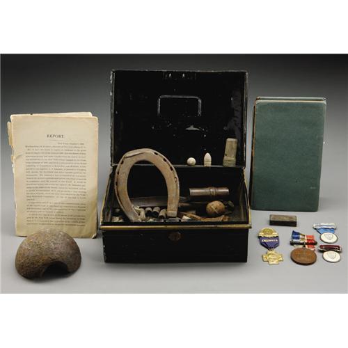 <B>Gettysburg Collection of Engineer A. J. Zabriskie, New York Board of Gettysburg Monuments Commissioners.</B></I> Includes: the workbook Zabriskie used on his 1892 and 1894 visits to the battlefields of Gettysburg and Chattanooga with notes regarding the placement of monuments to the 44th, 134th, and 136th New York regiments and Geary's Division; drop bullets; fired bullets; canister balls; half a spherical artillery shell; bottom portion Union Schenkl shell; brass Enfield rifle front cap; musket wrench; broken bronze bayonet from a monument; horse shoe; broken sword blade; pistol barrel; knap sack hook; lead artillery fuse cap; bullet worm; iron cannonball fuse cap; two Gettysburg medals; two civil engineer badges owned by Zabriskie; and his printing block (50+ items). The collection comes with a letter of provenance. An interesting group in a tin document box.<BR><BR><b>Shipping:</b> Other (oversized items, group lo (<a target="_blank" href="http://www.heritageauctions.com/common/shipping.php">view shipping information</a>)