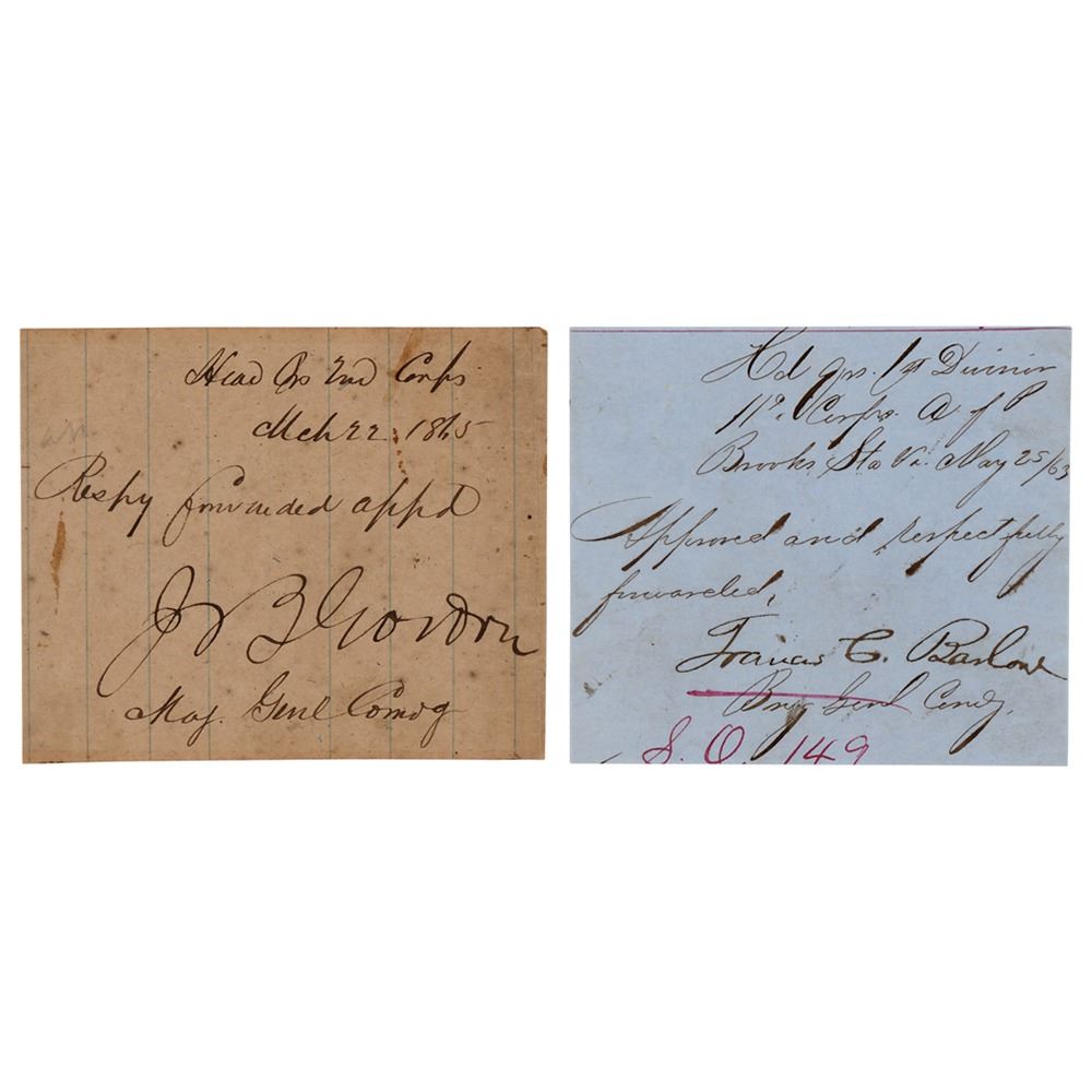 Superb pairing of signatures from the protagonists in the 'Barlow-Gordon incident,' a poignant (though possibly apocryphal) story of old enemies coming together told amidst post-war reconciliation efforts. The lot includes two endorsement signatures clipped from Civil War-dated documents: an ink signature, "Francis C. Barlow," on a light blue 3 x 2.75 slip, dated May 25, 1863; and an ink signature, "J. B. Gordon," on an off-white 3.25 x 2.75 slip, dated March 22, 1865. In fine condition.