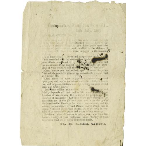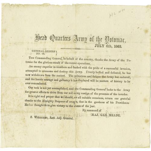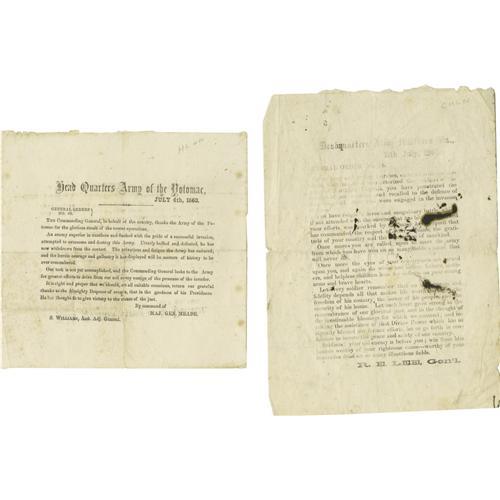 <B>Gettysburg General Orders From Generals Meade and Lee.</B></I> The original field press-printed Congratulatory Orders issued by General Lee to his troops after they crossed the Potomac into Virginia following the battle of Gettysburg accompanied by General Meade's Congratulatory Orders issued to his troops after the Battle of Gettysburg- a unique opportunity to acquire both orders from both armies. Signed in print by Meade and Lee respectively, these announcements capture the mood of each contender. Federal imprint, GENERAL ORDERS NO. 68, one page, 6.5" x 6.5", July 4, 1863. It reads in part: "...An enemy superior in numbers and flushed with pride of a successful invasion, attempted to overcome and destroy this Army. Utterly baffled and defeated, he has now withdrawn from the contest. The privations and fatigue the Army has endured, and the heroic courage and gallantry it has displayed will be matters of history to be ever remembered...". Smoothed folds, faint ink offsetting, light foxing, else fine condition; Confederate broadside, GENERAL ORDER NO. 76, one page, 6,25" x 8,75", July 11, 1863. It reads, "after long and trying marches, endured with the fortitude that has characterized the soldiers of the Army of Northern Virginia, you have penetrated the country of our enemies and recalled to the defence of their own soil, those who were engaged in the invasion of ours. You have fought fierce and sanguinary battle, which if not attended with the success that has hitherto crowned your efforts, was marked by the same heroic spirit that has commanded the respect of your enemies, the gratitude of your country and the admiration of mankind. Once more you are called upon to meet the army from which you have won so many fields a name that will never die. Once more the eyes of your countrymen are turned upon you, and again do wives and sisters, fathers, mothers, and helpless children lean for defence on your strong arms and brave hearts. Let every soldier remember that on his courage and fidelity depends all that makes life worth having... the freedom of his country, the honor of his people, and the security of his home. Let each heart grow strong in the remembrance of our glorious past, and in the thought of the inestimable blessings for which we contend; and invoking the assistance of that Divine Power which has so signally blessed our former efforts, let us go forth in confidence to secure the peace and safety of our country. Soldiers! your old enemy is before you; win from him honors worthy of your righteous cause---worthy of your comrades dead on so many illustrious fields." Of the highest rarity, this document was printed in the field on the retreat from Pennsylvania. Ink stains on the paper - as made - are evidence of the Confederate printer's urgency under duress. Overall fine condition. Parrish and Willingham #1226 with only two known field-press examples, those being in the Virginia State Library and the Virginia Historical Society.<BR><BR><b>Shipping:</b> Small Flat (<a target="_blank" href="http://www.heritageauctions.com/common/shipping.php">view shipping information</a>)