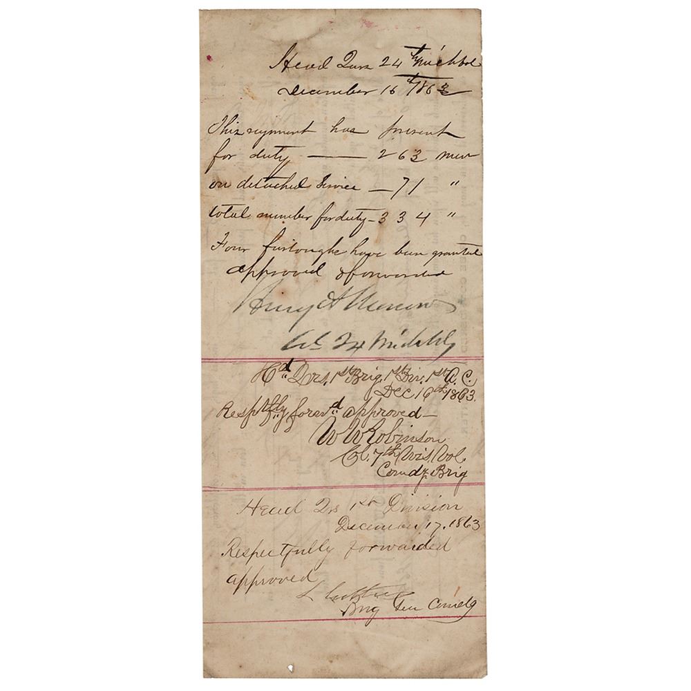 DS, one page, 3.25 x 8, December 16-17, 1863. Docketing panel cut from a furlough document, issued from the Headquarters of the 24th Michigan. In part: "This regiment has present for duty—263 men, on detached service—71, total number for duty—334, Four furlough have been granted." Signed by Col. Henry Morrow of the 24th Michigan, Col. W. W. Robinson of the 7th Wisconsin, and Brig. Gen. Lysander Cutler of the 1st Division, I Corps. In fine condition, with scattered light soiling.