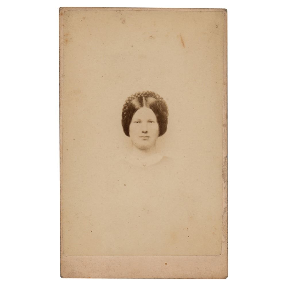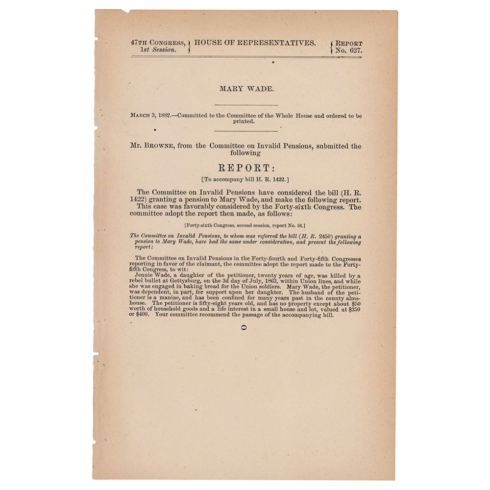 The lot includes: an original 2.5 x 4 carte-de-visite portrait of Jennie Wade by Isaac G. Tyson of Gettysburg, Pennsylvania; an original vintage glossy 5.5 x 3.25 postcard of the Gettysburg house where Jennie Wade was killed; and a printed Congressional report removed from a bound volume, recommending the award of a pension to her mother, Mary Wade: "Jennie Wade, a daughter of the petitioner, twenty years of age, was killed by a rebel bullet at Gettysburg…within Union lines, and while she was engaged in baking bread for the Union soldiers…Your committee recommend the passage of the accompanying bill." In overall fine condition.