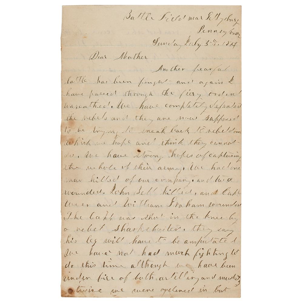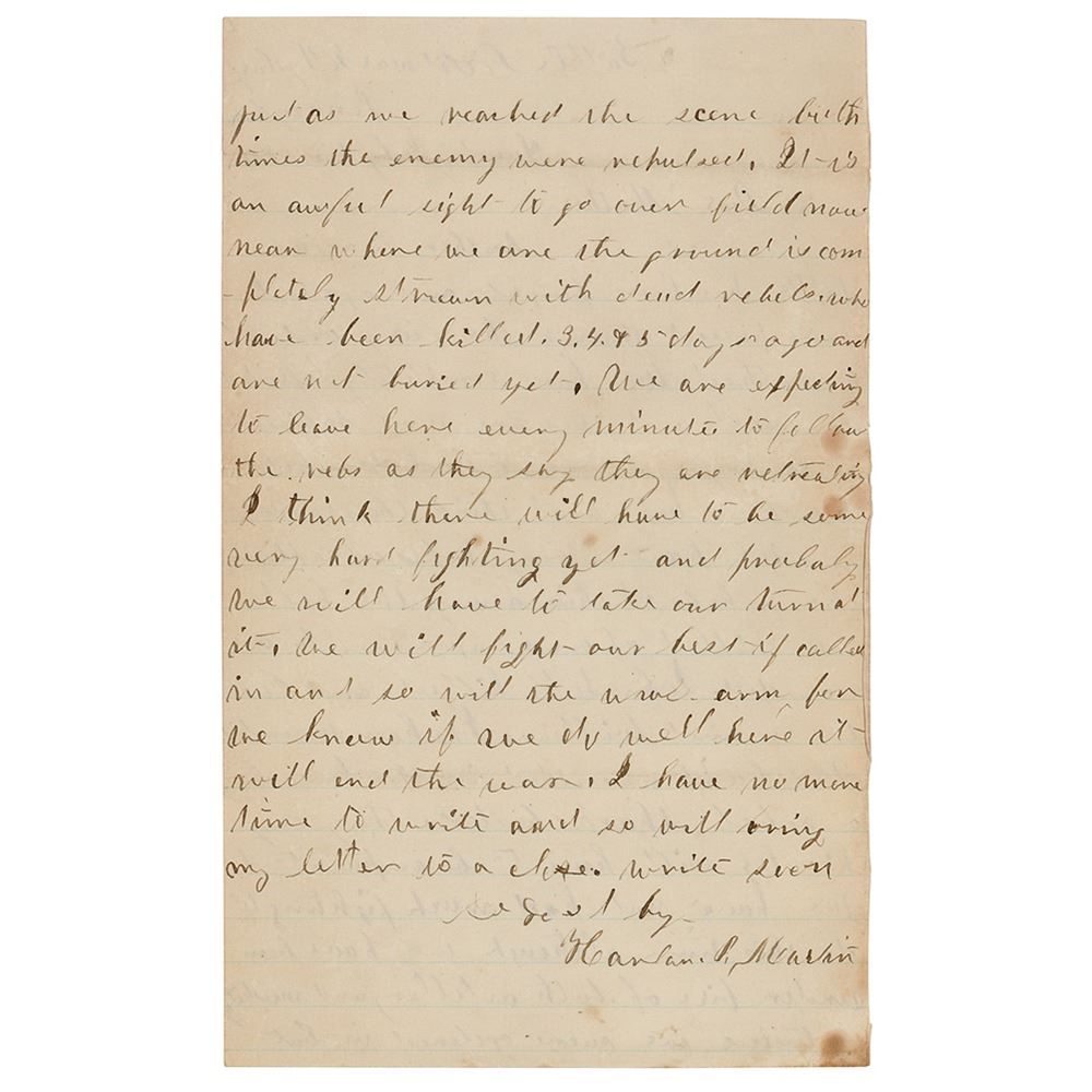 ALS signed "Harlan P. Martin," one page both sides, 4.75 x 7.75, July 5, 1863. Handwritten letter from the "Battle Field near Gettysburg, Pennsylvania," in part: "Dear Mother, Another fearful battle has been fought and again I have passed through the fiery ordeal unscathed. We have completely defeated the rebels and they are now supposed to be trying to sneak back to rebeldom…We have strong hopes of capturing the whole of their army. We had one killed…The Capt. was shot in the knee by a rebel sharpshooter. They say his leg will have to be amputated…It is an awful sight to go over field now…the ground is completely strewn with dead rebels who have been killed 3, 4, & 5 days ago and are not buried yet. We are expecting to leave here every minute to follow the rebs as they say they are retreating." In fine condition. Harlan P. Martin was a private in the 123rd New York Volunteer Infantry. A remarkable eyewitness account of the casualties at Gettysburg, which marked the turning point in the Civil War.
