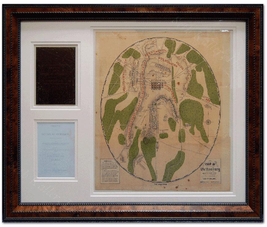 Sketched map of the Gettysburg 1-3 July 1863 battle, likely the first published map of the historic Civil War battle. Printed in 1863, map shows Gettysburg and its environs in a scaled oval, with green shaded areas denoting woods, and blue and red denoting Union and Confederate troop placement, respectively. Also shows the town and all principal roads, with an account of the movements of the respective armies previous to the battle, compiled by eyewitnesses. The chromolithographed ''Field of Gettysburg'' map, measuring 16.5'' x 20'', has been detached from a 24pp. book ''Exploratory Map of Gettysburg'' engraved by T. Diterrline. Originally published by C.A. Alvord: New York: 1863. Also includes a printed testimonial by George Childs, noted philanthropist and publisher of the influential ''Philadelphia Public Ledger'', dated 23 October 1863. Childs expresses his high opinion of the map, ''which is shared by several officers in the battle.'' On the last page of the pamphlet, the map's engraver, Ditterline, indicates his indebtedness, ''...to the several correspondents of the press who were present and witnessed the battles, and from whose descriptions of the fight he has freely extracted; as also to the citizens of the town...'' Framed map is in near fine condition.