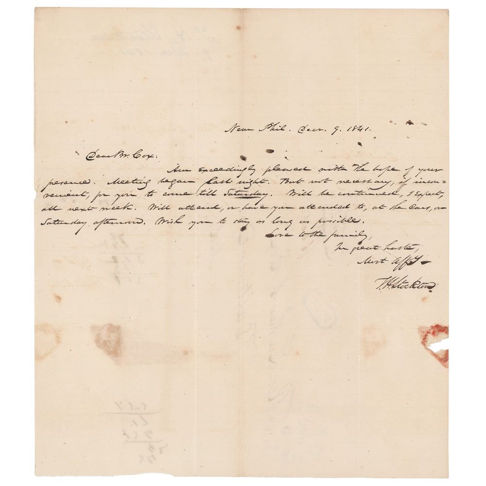 ALS signed "T. H. Stockton," one page, 7.75 x 8.75, December 9, 1841. Handwritten letter to Rev. Luther Cox in Baltimore, in full: "Am exceedingly pleased with the hope of your presence. Meeting began last night. But not necessary, if inconvenient, for you to come till Saturday. Will be continued, I expect, all next week." In fine condition, with a few light stains and some seal-related loss to lower right edge.