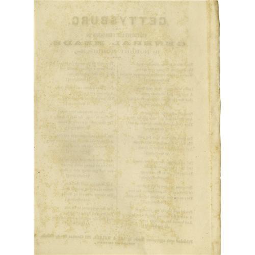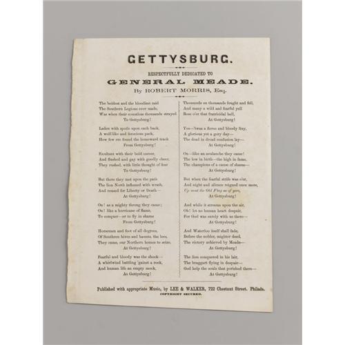 <B>"Gettysburg" Song Sheet,</B></I> published by Lee & Walker, Philadelphia. This war date song was penned by one Robert Morris, possibly a descendant of <B>THE</B></I> Robert Morris, Declaration of Independence Signer from Pennsylvania. The title line of the sheet dedicates it to General Meade, victor at Gettysburg, and is followed by fourteen stanzas of patriotic lyrics. Light aging, uneven trim, yet quite rare and a good addition to any collection focusing on the great battle.<BR><BR><b>Shipping:</b> Small Flat (<a target="_blank" href="http://www.heritageauctions.com/common/shipping.php">view shipping information</a>)
