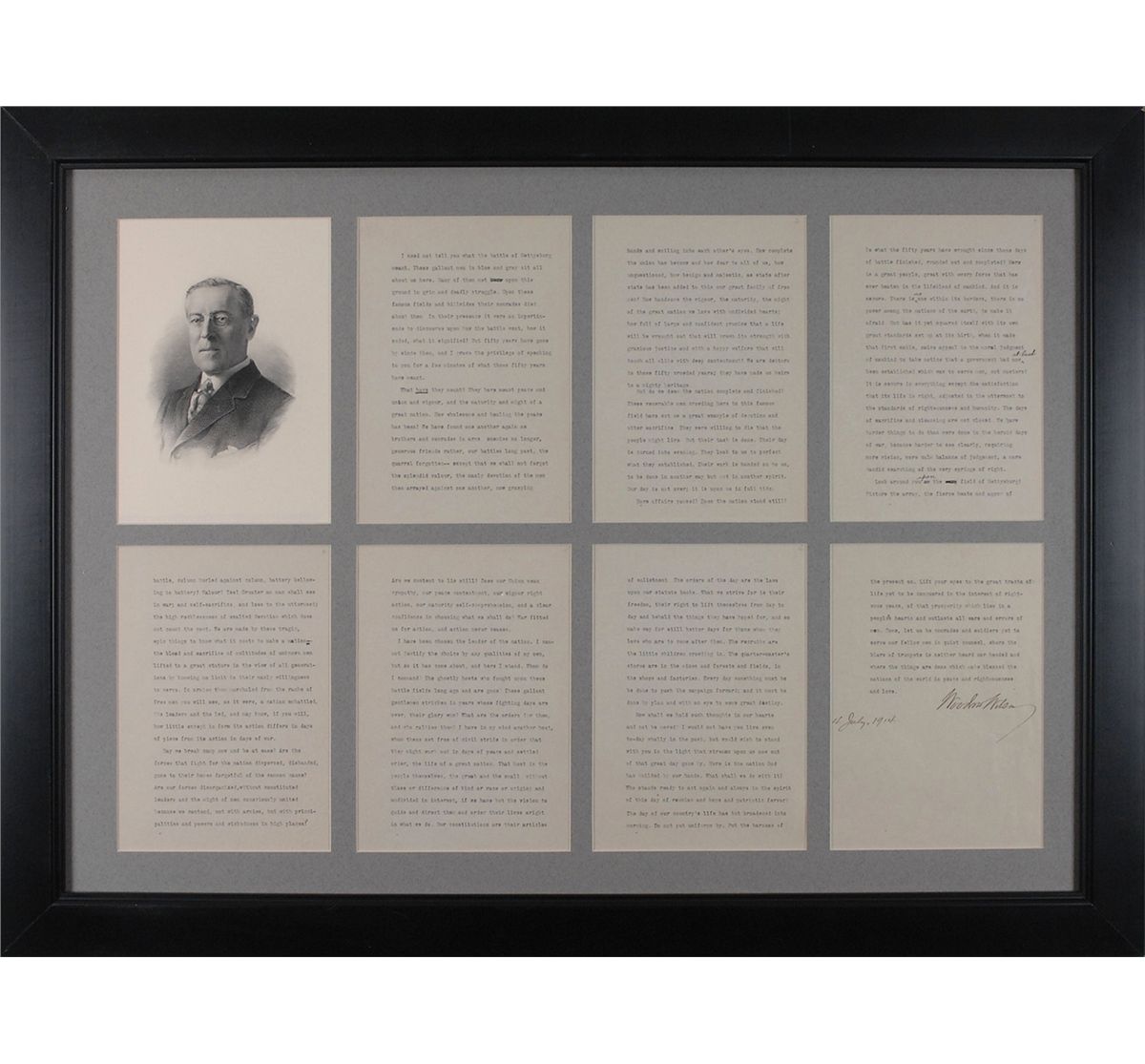 Historic typed speech, annotated and signed as president, “Woodrow Wilson,” seven pages, 5.75 x 8, dated by Wilson, “4 July, 1914 [sic, 1913].” This speech was delivered at the 50th anniversary of the Battle of Gettysburg, with several notations and corrections in Wilson’s hand, and reads, in part: “I need not tell you what the battle of Gettysburg meant. These gallant men in blue and gray sit all about us here. Many of them met upon this ground in grim and deadly struggle. Upon these famous fields and hillsides their comrades died about them. In their presence it were an impertinence to discourse upon how the battle went, how it ended, what it signified! But fifty years have gone by since then, and I crave the privilege of speaking to you for a few minutes of what those fifty years have meant. What have they meant? They have meant peace and union and vigour, and the maturity and might of a great nation. How wholesome and healing the peace has been! We have found one another again as brothers and comrades in arms, enemies no longer, generous friends rather, our battles long past, the quarrel forgotten—except that we shall not forget the splendid valour, the manly devotion of the men then arrayed against one another, now grasping hands and smiling into each other's eyes. How complete the union has become and how dear to all of us, how unquestioned, how benign and majestic, as state after state has been added to this our great family of free men! How handsome the vigour, the maturity, the sign of the great nation we love with undivided hearts."
