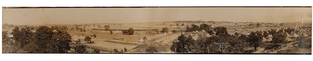 Impressive original 8 x 21 silver gelatin print of a panoramic image titled “Gettysburg Camp, 50th Anniversary, July, 1913,” by Frank Edwards. Image shows hundreds of tents set up with a train running through the center. Lightly trimmed vertical edges, and some small edge tears and creases, otherwise fine condition. Rolled. The June 29–July 4 gathering of 53,407 veterans was the largest ever Civil War veteran reunion. All honorably discharged veterans in the Grand Army of the Republic and the United Confederate Veterans were invited, and veterans from 46 of the 48 states attended.