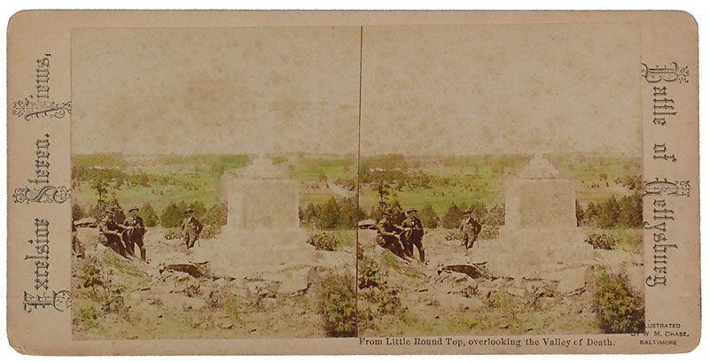 Original hand-tinted 7 x 3.5 stereoview of the perspective from Little Round Top overlooking the Valley of Death. Published by Excelsior Stereo Views. In very good condition, with overall foxing to the image.
