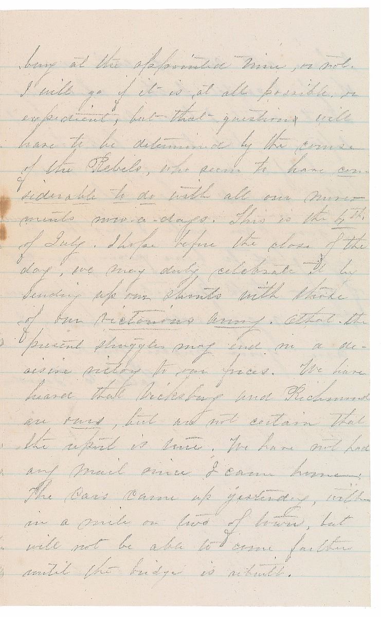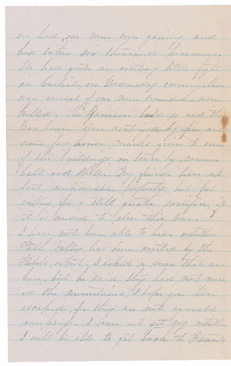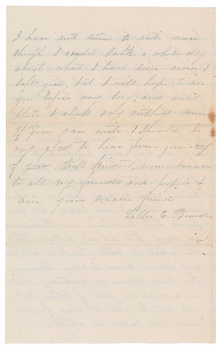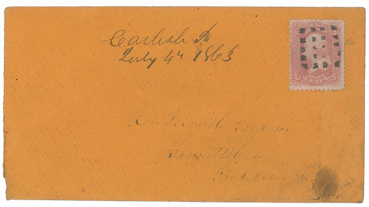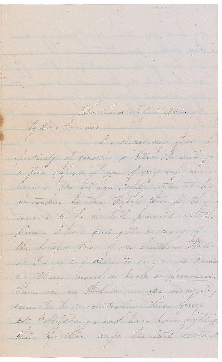 Civil War–dated ALS in pencil, signed “Lollie E. Boardman,” four pages on two adjoining sheets, 4.75 x 7.75, Wheatland, July 4, 1863. Letter to Rev. Gordon of Fannettsburg, Pennsylvania. In part: “I embrace my first opportunity of sending a letter to write you a line informing you of my safe arrival home. We got here safely without being mistaken by the Rebels though they seemed to be in hot pursuit all the time. I have seen quite as many of the boasted sons of our Southern States, as I have any desire to see, unless I could see them marched back as prisoners. There are no Rebels near us now. They seem to be concentrating their forces at Gettysburg, and have been fighting there for three days. The last account we had, our men were gaining and have taken six thousand prisoners. We had quite an exciting little fight in Carlisle on Wednesday evening. There were several of our men wounded—none killed. The Jamison buildings and the Gas House were destroyed by fire and some few honor marks given to some of the buildings in town by cannonball and shell. My friends have all lost considerable property, but feel willing for a still greater sacrifice, if it is needed to close this war. I have not been able to hear whether Path Valley, has been visited by the Rebels, or not. I asked a man that was here, but he said they have not crossed the mountains. I hope you have escaped, for they are not agreeable company…This is the 4th of July. I hope before the close of the day, we may duly celebrate it by sending up our sheets with those of our victorious army, & that the present struggle may end in a decisive victory to our forces. We have heard that Vicksburg and Richmond are ours, but are not certain that the report is true.” In fine condition, with writing very light but legible and a trivial stain to one edge. Accompanied by the original mailing envelope.