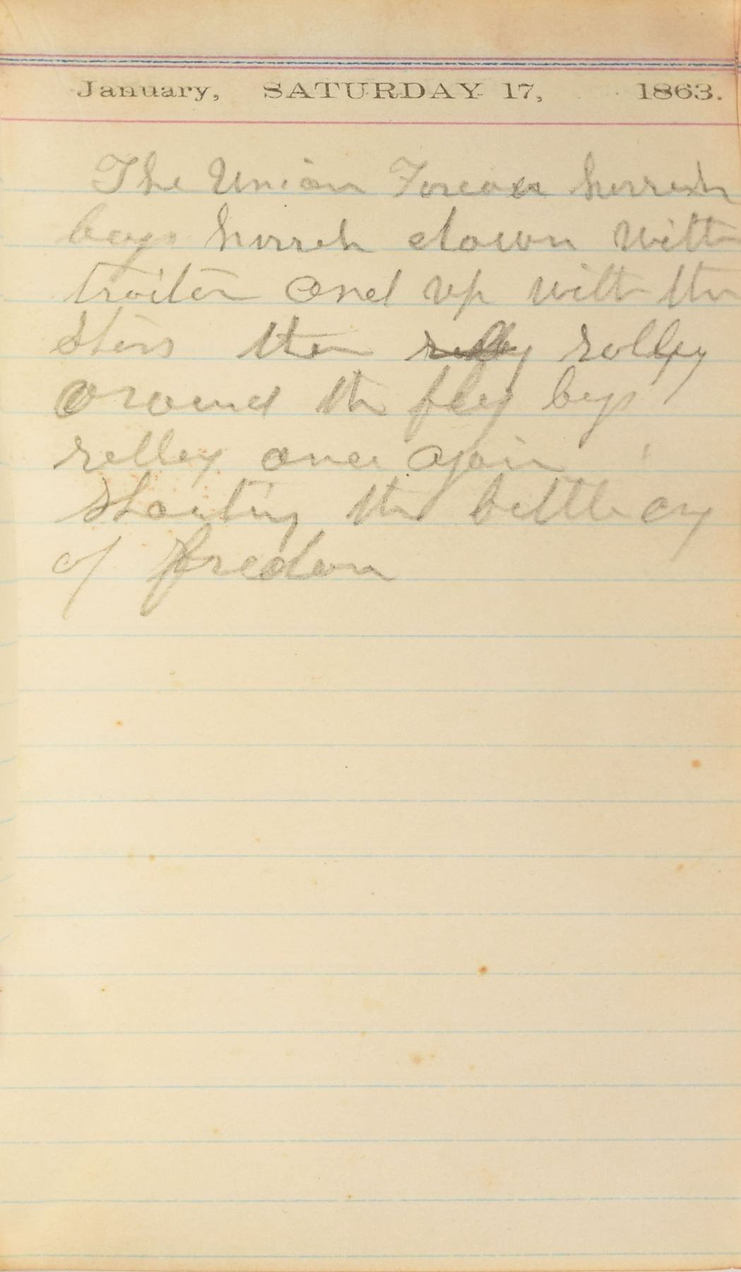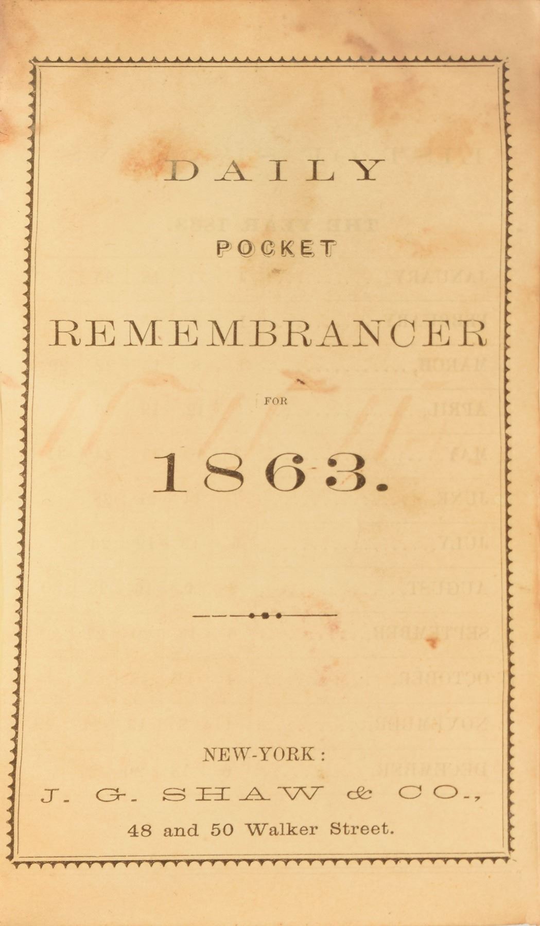 An 1863 leather-wrapped pocket diary kept by William W. Weller of Littleton, New Hampshire, who enlisted in the Union Army on April 20, 1861, as a private in Company G of the 2nd New Hampshire Volunteer Regiment. Though he appears to have carried this diary with him throughout the year of 1863, he did not write extensively; there are about 140 pages with a few lines of writing, of which about a dozen refer to the war. These entries are sporadic and usually just one or two lines long. On January 17, he writes the lyrics to 'Rally Round the Flag': "The Union Forever hurrah / boys hurrah down with / traiter and up with the / Star then ralley ralley / around the flag boys / ralley once again / Shouting the battle cry / of freedom."