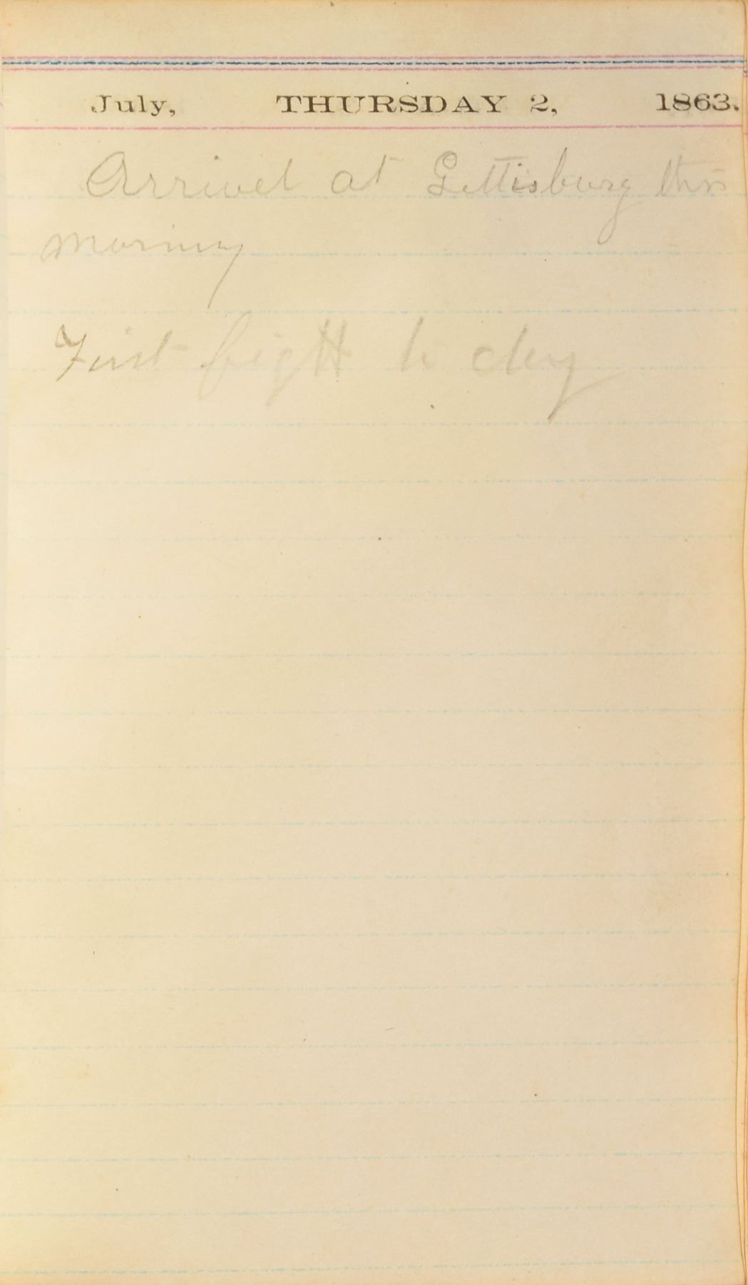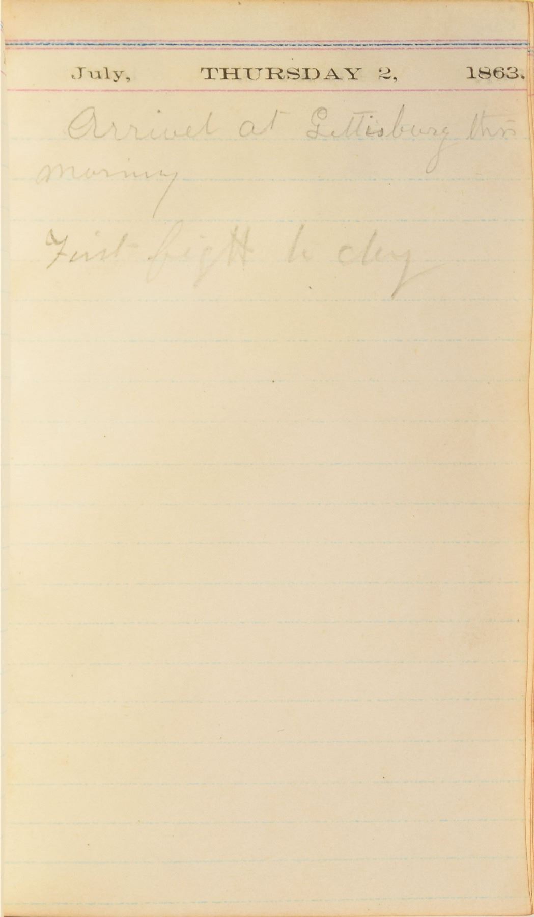 July 2: "Arrival at Gettisburg this morning. First fight to day."