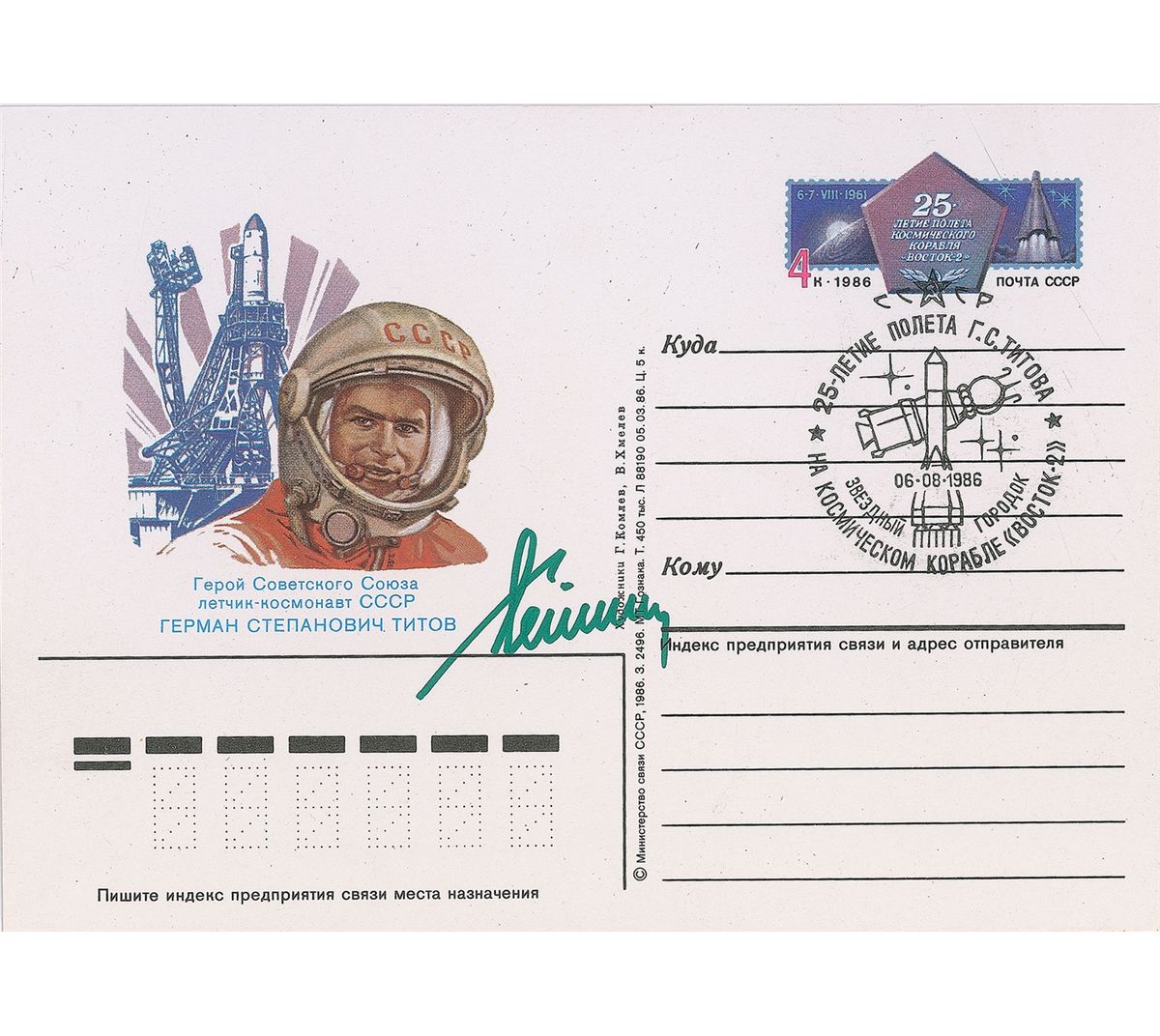 Commemorative Soviet postcard, with a color cachet honoring Titov’s mission, 5.75 x 4, signed in green felt tip. In very fine condition.