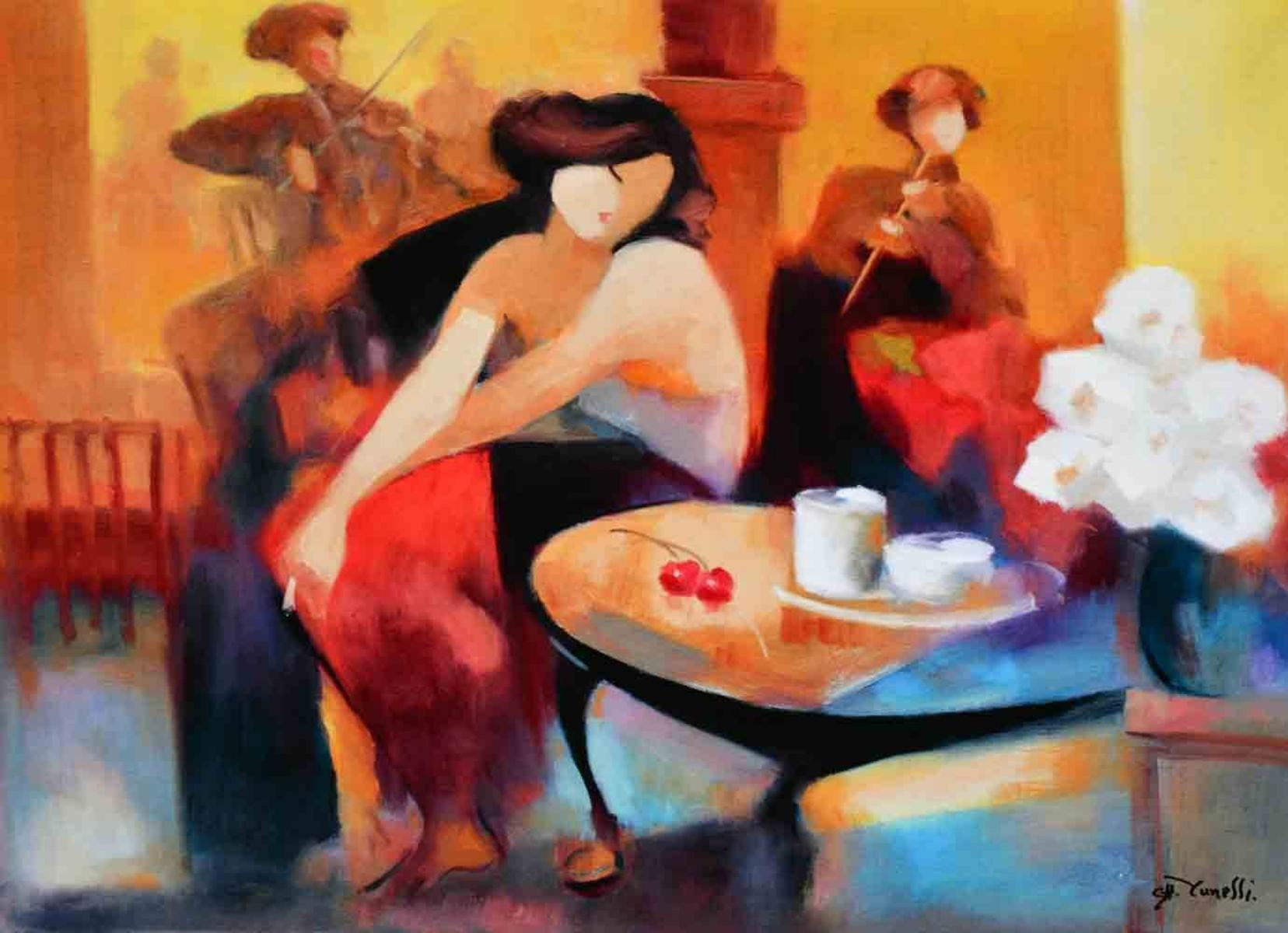 Artist: Gholam Yunessi - Title: Sweet Serenade - Medium: Fine Art Giclee on Canvas - Signature: Hand Signed by the Artist - Image Size: Approximately 24 inches x 30 inches - Framed: Unframed on Unstretched Canvas - Details: This work comes with a Certificate of Authenticity - Biography: Gholam Yunessi's talent has been molded through years of dedication to the masters of his native Tehran - starting with one of Persia's most famous sculptors, his uncle Esamaeel Yunessi. At the young age of five, Gholam's creative foundations were nurtured and shaped by this familial guide. - In high school, Gholam's talent continued to develop in drawing and charcoal renderings under the guidance of the renowned Persian artist Shaness. Gholam ultimately went on to study the history and technique of fine art painting at the Tehran College of Fine Art. Yunessi finally brought his rich balance of near-eastern and European influences to America, where he has continued to create and produce work that has been recognized and exhibited around the world since 1972.