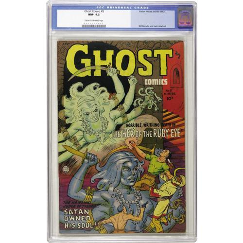 <B>Ghost #5 (Fiction House, 1952) CGC NM- 9.2 Cream to off-white pages.</B></I> This wild issue features the cover story "Horrible, Writhing Death in the Hex of the Ruby Eye" -- ahh, the freedom blurb-writers had in those pre-Code days! It's a great copy, too, sharp and glossy with deep rich color. Jack Abel and Bill Benulis get art credits here. Overstreet 2006 NM- 9.2 value = $350. CGC census 10/06: 1 in 9.2, 3 higher.<BR><BR><b>Shipping:</b> Slabbed Comic (<a target="_blank" href="http://www.heritageauctions.com/common/shipping.php">view shipping information</a>)