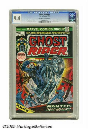 <B>Ghost Rider #1 (Marvel, 1973) CGC NM 9.4 Off-white to white pages.</B></I> After a smash-hit tryout in <B>Marvel Spotlight</B></I>, Johnny Blaze, aka Ghost Rider, roared into his own book, starting off a ten-year run. And as if his quasi-satanic visage wasn't diabolical enough, this book also had the first appearance of the Son of Satan, Daimon Hellstrom, in a brief cameo. The issue has a Gil Kane cover and Tom Sutton interior art. Overstreet 2005 NM- 9.2 value = $110. CGC census 1/05: 41 in 9.4, 15 higher. <I>From the collection of Chris Bell.</B></I>