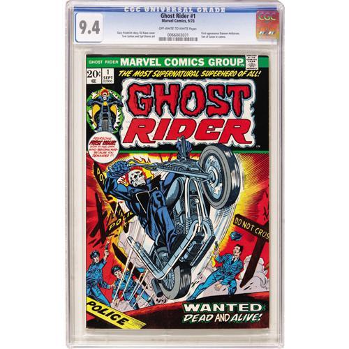 <B>Ghost Rider #1 (Marvel, 1973) CGC NM 9.4 Off-white to white pages.</B></I> After a smash-hit tryout in <B>Marvel Spotlight</B></I>, Johnny Blaze, aka Ghost Rider, roared into his own book, starting off a ten-year run. And as if his quasi-satanic visage wasn't diabolical enough, this book also had the first appearance of the Son of Satan, Daimon Hellstrom, in a brief cameo. The issue has a Gil Kane cover and Tom Sutton interior art. Overstreet 2006 NM- 9.2 value = $120. CGC census 3/07: 70 in 9.4, 32 higher.<BR><BR><b>Shipping:</b> Comics - Slabbed (certified) (<a target="_blank" href="http://www.heritageauctions.com/common/shipping.php">view shipping information</a>)