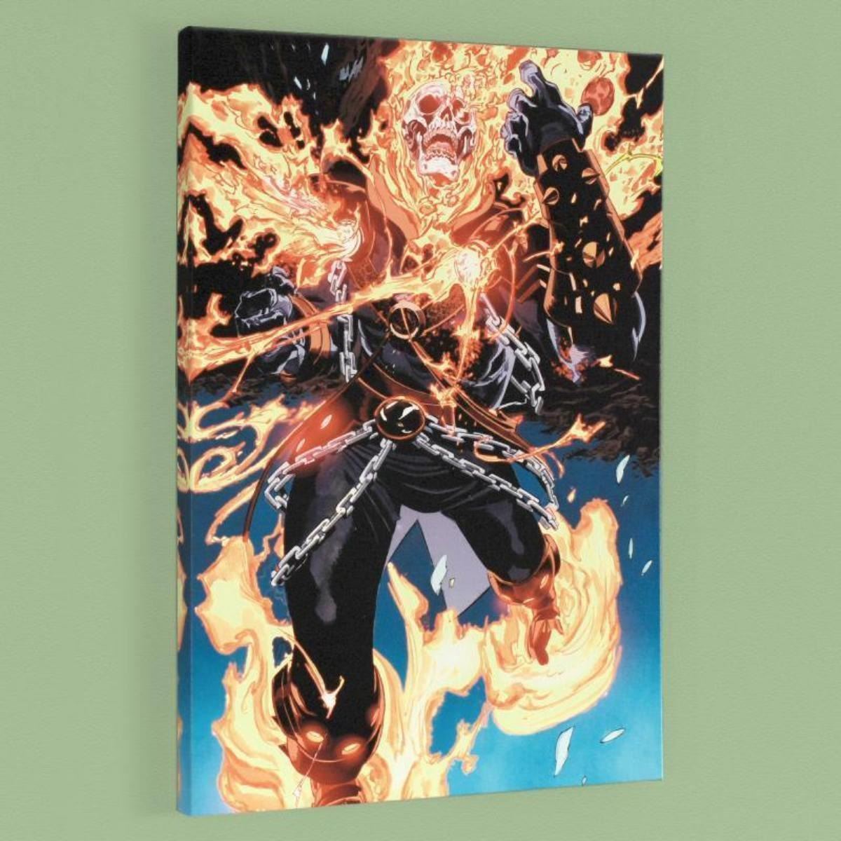 A piece of comic book history, this limited edition, from original art by Tan Eng Huat, depicts Ghost Rider in a Blaze of Fury. Named 'Best New Talent' in the National Comics Awards (NCA) 2002, Tan Eng Huat has been a featured artist for different comic companies such as Marvel. He is most recognized for his work on the Punisher, Ghost Rider, Annihilators, and Deadpool comics. "Ghost Rider #28" is a limited edition numbered giclee on stretched canvas by Tan Eng Huat presented by Marvel Comics. This piece comes gallery wrapped. Includes Certificate of Authenticity! Measure approx. 18" x 27" (image); 1.5" (depth).