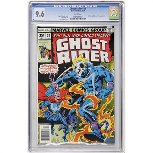<B>Ghost Rider #29 (Marvel, 1978) CGC NM+ 9.6 White pages.</B></I> Rich Buckler cover. Don Perlin art. Ghost Rider battles Dr. Strange. Overstreet 2007 NM- 9.2 value = $10. CGC census 1/08: 9 in 9.6, 2 higher.<BR><BR><b>Shipping:</b> Comics - Slabbed (certified) (<a target="_blank" href="http://www.heritageauctions.com/common/shipping.php">view shipping information</a>)