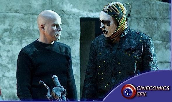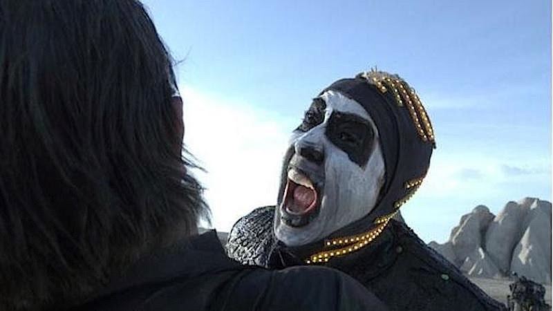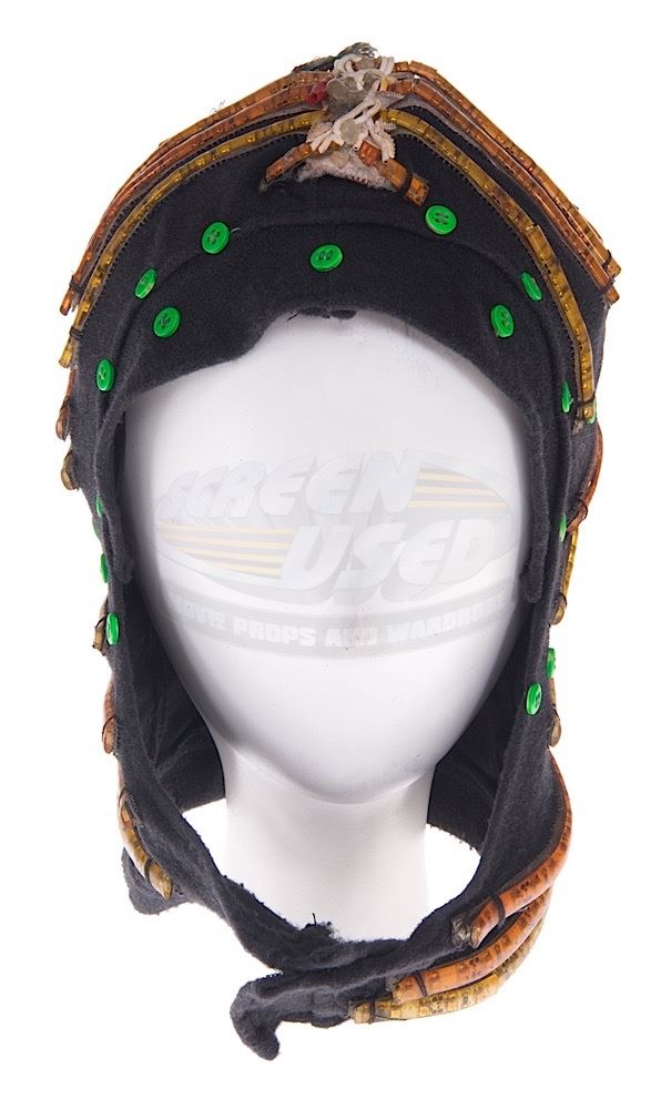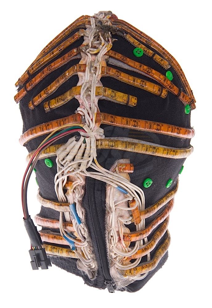 (Columbia Pictures, 2011) This cowl was custom-made by the production for use by Nicolas Cage as "Ghost Rider" to simulate the glow of fire and assist in post production CG effects of Ghost Rider's flaming head and neck. The black cloth cowl has orange and yellow LED strips covering the head and neck that are wired to a connector. Green painted buttons are also attached to various locations as reference points for tracking movement. The LEDs are untested.