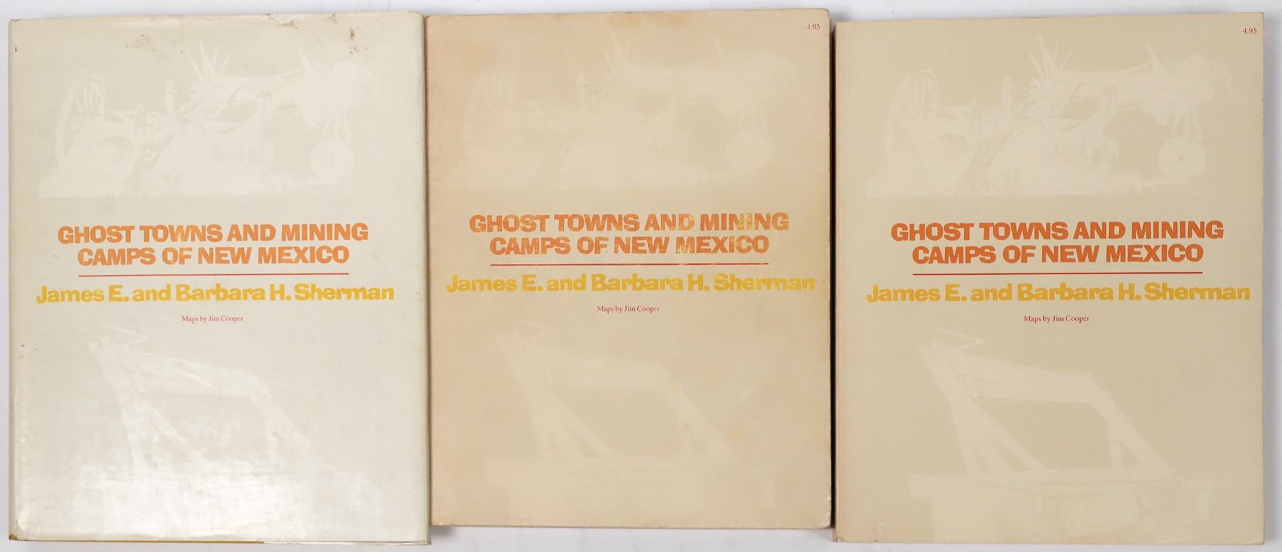 Thee copies of Ghost Towns and Mining Camps of New Mexico by James E. and Barbara H. Sherman. Maps by Jim Cooper. Published by the University of Oklahoma Press in 1975. Two paperback and one hardcover copy. All three copies are autographed by the authors.