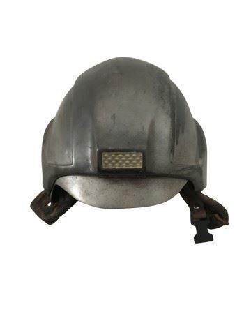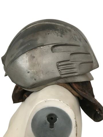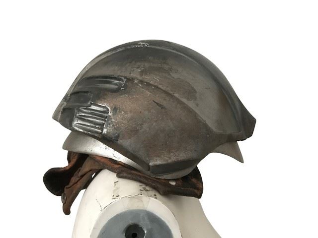 Ghost of Mars (2001)- Custom made light up helmet worn by the possessed miners on Mars. In this film, the costumer and armorer settled on a strategy to give as many of the warriors as they could distinct visual styles.  This is the only helmet available at this time. It was made from a plain helmet underneath and the production team designed a viking style over it. Constructed of a plastic/resin combination painted to look like rusted armor with a modern twist, with leather neck flaps snapped in place. The battery pack to power the light rested between the inner and outer shell of the helmet but is not inside this helmet. Direct from the set of the film. Excellent condition. Light is not functional  (12"x9"x7").