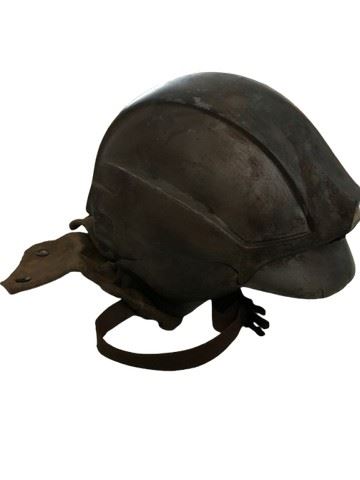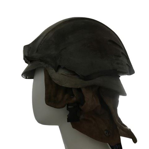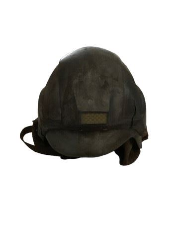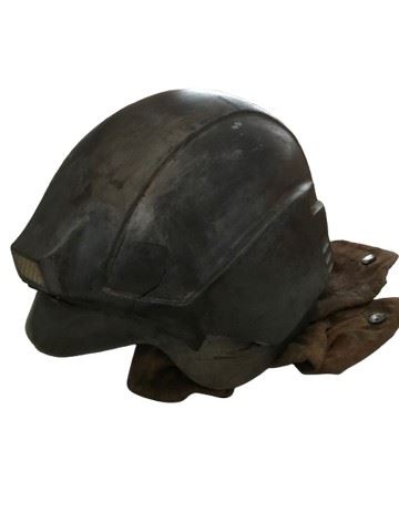 Ghost of Mars (2001)- Custom made helmet worn by the possessed miners on Mars. In this film, the costumer and armorer settled on a strategy to give as many of the warriors as they could distinct visual styles. It was made from a plain helmet underneath and the production team designed a viking style over it. Constructed of a plastic/resin combination painted to look like rusted armor with a modern twist, with leather neck flaps snapped in place. There is typically a battery pack to power the light rested between the inner and outer shell of the helmet but this is not included in this helmet. Direct from the set of the film. Excellent condition. Light is not functional and there is a crack on the left side of the helmet (12"x9"x7"). Includes prop tag labeled Paul Sanchez #8.