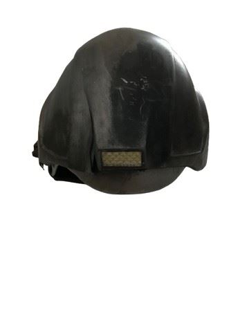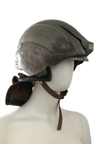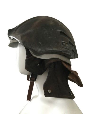 Ghost of Mars (2001)- Custom made light up helmet worn by the possessed miners on Mars. In this film, the costumer and armorer settled on a strategy to give as many of the warriors as they could distinct visual styles. It was made from a plain helmet underneath and the production team designed a viking style over it. Constructed of a plastic/resin combination painted to look like rusted armor with a modern twist, with leather neck flaps snapped in place. There is typically a battery pack to power the light rested between the inner and outer shell of the helmet but this is not included in this helmet. Direct from the set of the film. Excellent condition. Light is not functional and a crack runs through the top right of the helmet with some chips around the front border (12"x9"x7").