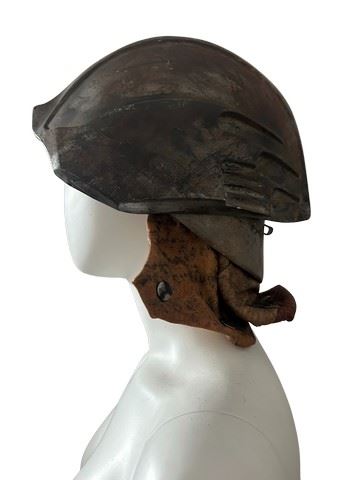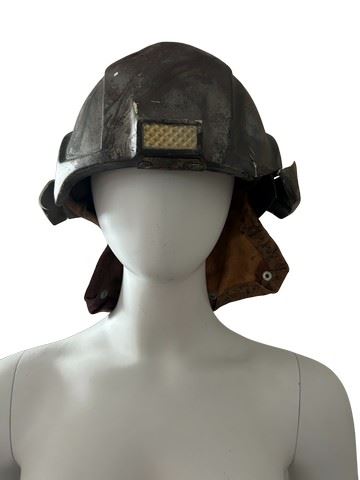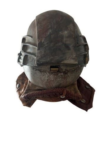 Ghost of Mars (2001)- Custom made light up helmet worn by the possessed miners on Mars. In this film, the costumer and armorer settled on a strategy to give as many of the warriors as they could distinct visual styles. It was made from a plain helmet underneath and the production team designed a viking style over it. Constructed of a plastic/resin combination painted to look like rusted armor with a modern twist, with leather neck flaps snapped in place. There is typically a battery pack to power the light rested between the inner and outer shell of the helmet but this is not included in this helmet. Direct from the set of the film. Excellent condition. Light is not functional and a crack exists on both sides of the helmet. This is the last hat available! (12"x9"x7").