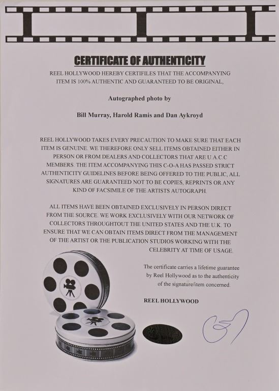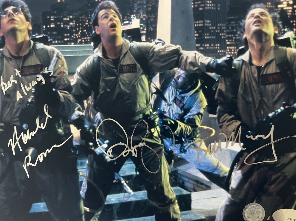 Ghostbusters cast signed photo autographed by Bill Murray, Dan Aykroyd and Harold Ramis. GFA authenticated. 8x10 inches. HL20472
