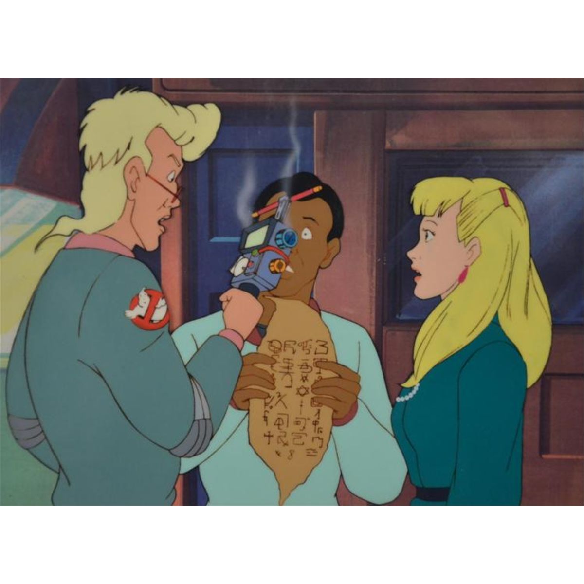 This is an original animation cel used in the production of the 1986 animated series The Real Ghostbusters. Winston is holding some kind of cryptic message here, as Egon holds some kind of gadget, as he often does. * Medium: Hand painted cel acetate with printed backgroundImage size: 8 x 10 inchesPresentation: Double matted in white and red, ready for framingMatte size: 14 x 16 inchesCondition: ExcellentCertificate of Authenticity: Included