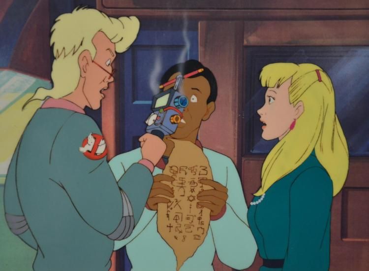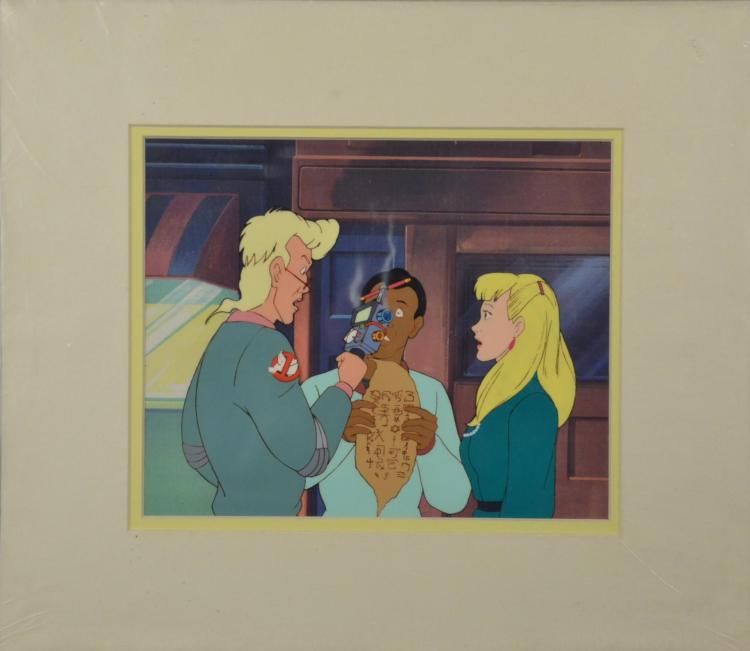 This is an original animation cel used in the production of the 1986 animated series The Real Ghostbusters. Winston is holding some kind of cryptic message here, as Egon holds some kind of gadget, as he often does. * Medium: Hand painted cel acetate with printed backgroundImage size: 8 x 10 inchesPresentation: Double matted in white and red, ready for framingMatte size: 14 x 16 inchesCondition: ExcellentCertificate of Authenticity: Included