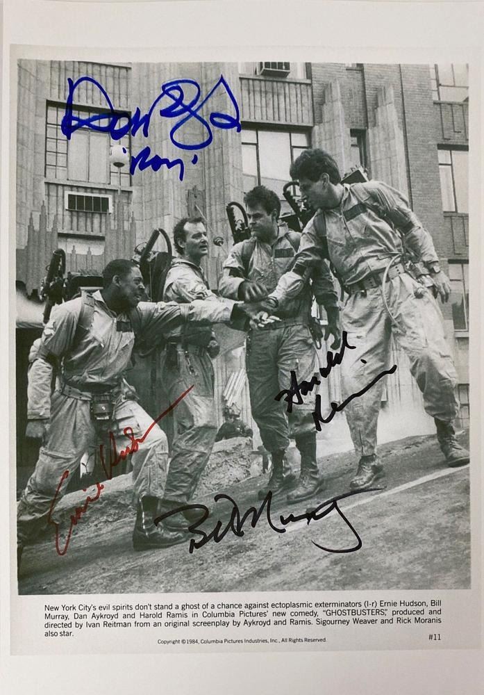 Ghostbusters cast facsimile signed movie photo autographed by Bill Murray, Dan Aykroyd, Harold Ramis and Ernie Hudson. 8x10 inches. This item is a reprint of an original autograph