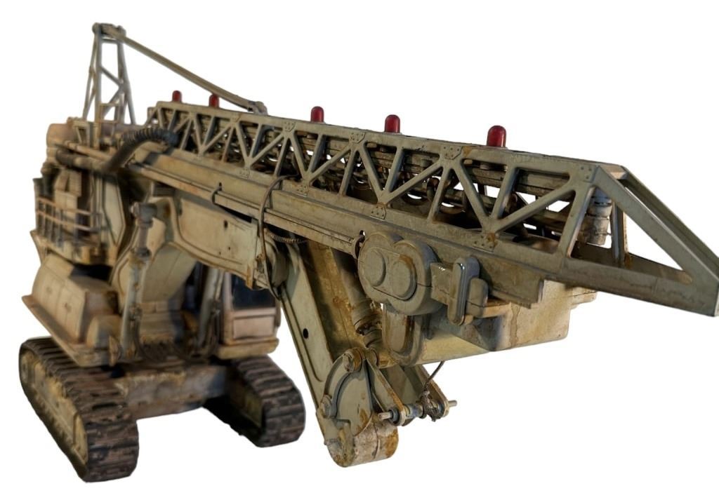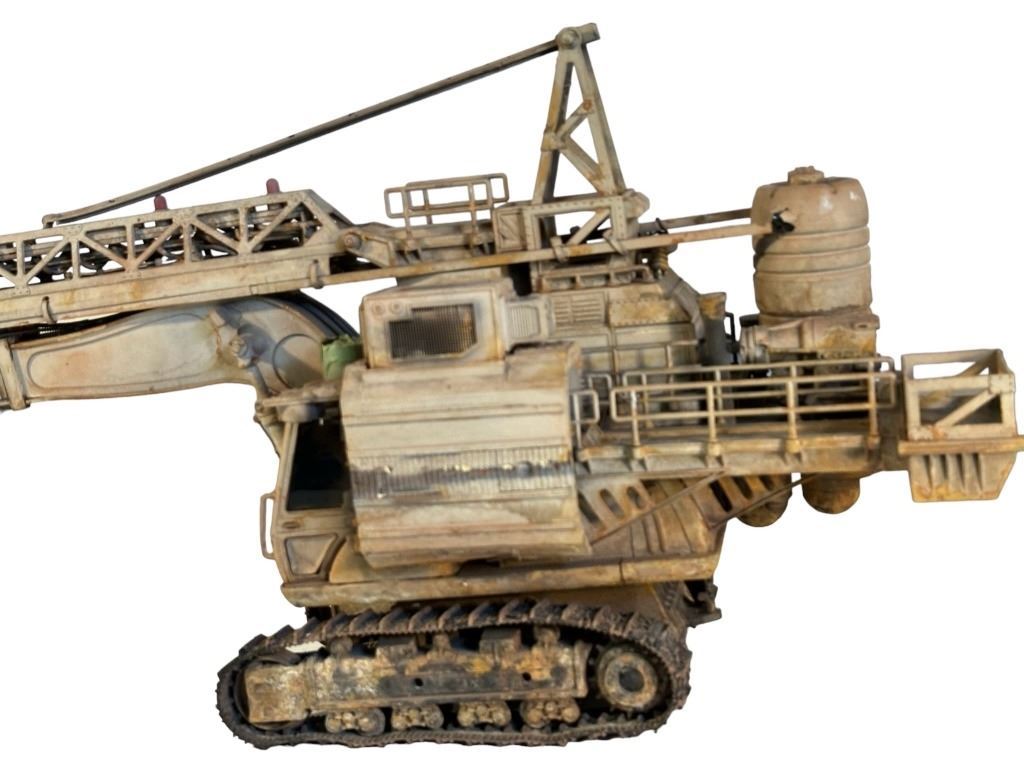 Kit bashed model made of plastic model parts, wiring, rubber tracks.