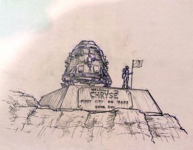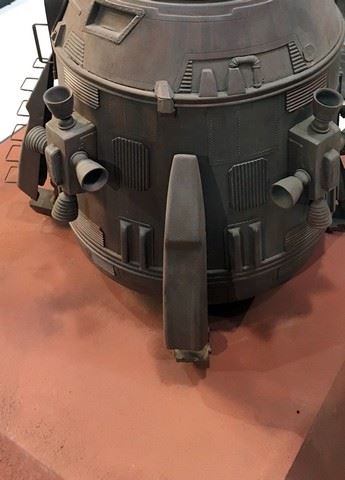 Ghost of Mars (2001) - This trapezoidal shaped monument was built and shot for the entrance of Chryse City from the film. Made from MDF wood and featuring a laser cut acrylic placard, it also includes a plastic, fiberglass, and resin Mars Lander and figure built by New Deal Studios Cofounder Ian Hunter and placed on the base as originally shot. Later it was decided to remove the lander and figure and re-shoot the base, the only part to remain in the movie. Drawn by New Deal Studios co-founder, Ian Hunter. 24"' tall x 24" wide. 1:16 ratio. This incredible, handmade miniature is from the celebrated collection of Academy Award winning New Deal Studios. New Deal Studios is a 21st Century Media Studio, unlike any in the world. A full-service film production and visual effects studio, with over 20 years of iconic imagery, New Deal Studios develops, designs, prototypes, and creates all types of high caliber media projects. Founded in 1995 by Matthew Gratzner, Ian Hunter and Shannon Blake Gans, this artist owned and operated independent studio, born in the heyday of visual effects, has truly evolved into the technology driven studio for the future, consistently delivering the perfect marriage of artistry and technology. Award winning credits by New Deal Studios include high-profile projects such as Dark Knight Rises, Hugo, The Avengers, Oz the Great and Powerful, Iron Man, The Dark Knight, Watchmen, I am Legend, Night at the Museum, Whiteout, 2012, Alice in Wonderland, Inception, Battleship and Interstellar.