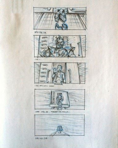 Storyboard drawn for all visual effects shots in the film "John Carpenter's Ghosts of Mars" These hand drawn storyboards cover a variety of scenes including wide shots of the Mars train, open pit mine where the ghosts warriors first appear, a spectacular balloon crash, a hallucinogenic dream scene, and a myriad of John Carpenter inspired spearings, stabbings, and decapitations. Drawn by New Deal Studios Co-Founder Ian Hunter. 8.5" x 11"