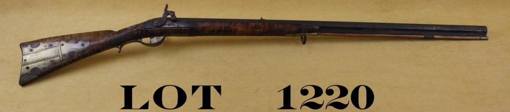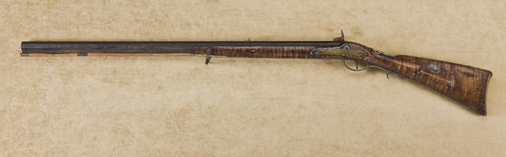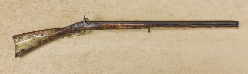 Ghriskey, Philadelphia-marked Indian trade type rifle. Converted from flintlock to percussion, barrel approx. 30-1/4”, 45-3/4” overall. Stock shortened to half length with high quality early patchbox, checkered wristand interesting silver mounts. The wrist is mounted with an early clasp from what was probably a bible and there are two other thin silver inlays, one just behind the tang and one at the cheek piece. A crude iron swivelhas been added to the forend. The stock shows great weathering and old repairs and the rifle has seen great use on the early frontier. There is some weathering and opening to the grain, the metal surfaces show a medium to dark patina with light to slightly heavy varying pitting and erosion and no cleaning. Refer: James Gordon Book. Est: $4,000 - $6,000
