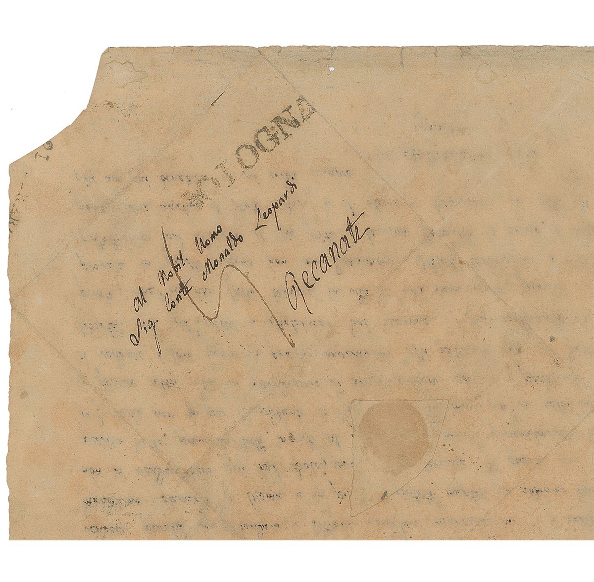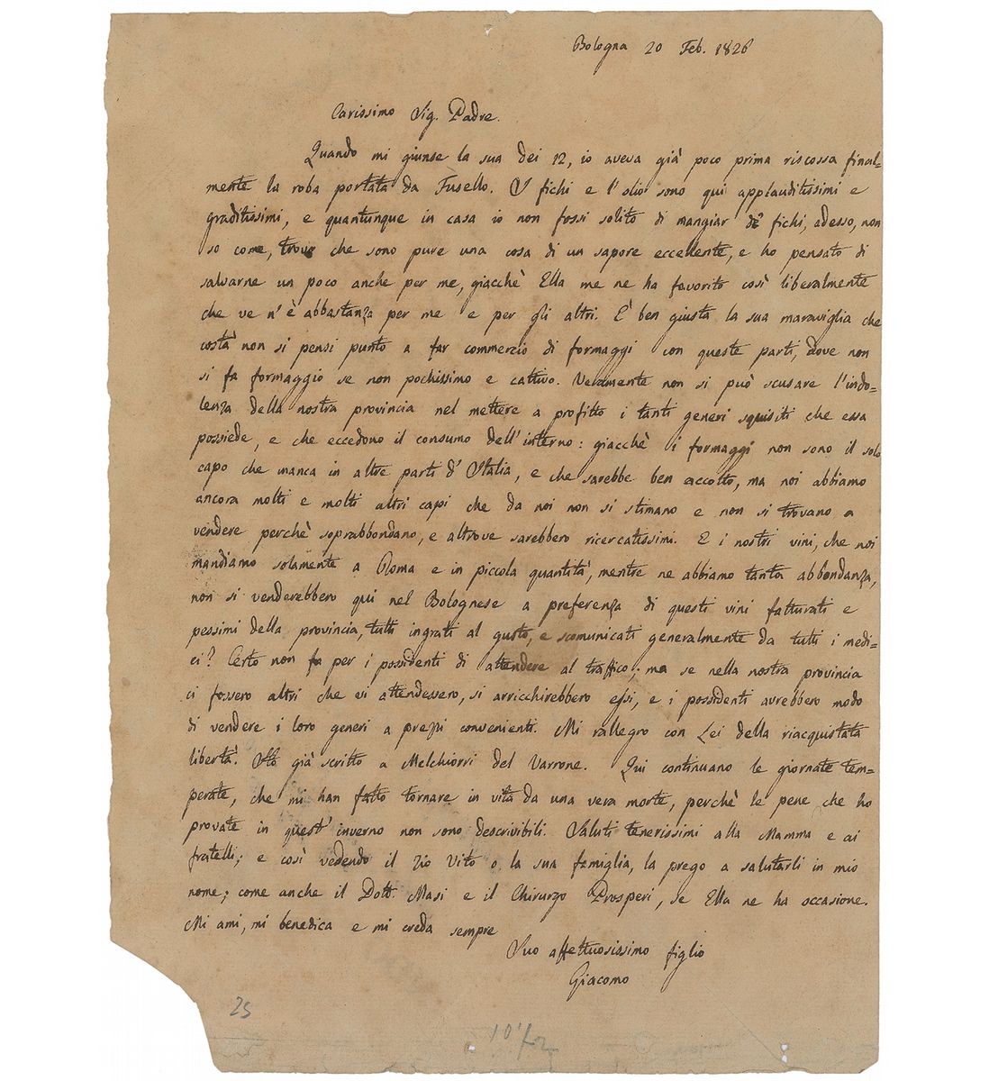 ALS in Italian, signed “Giacomo,” one page, 7.5 x 10.25, February 18, 1826. A letter thanking his father for the presents of figs in oil, and discussing the progress that could be made in also selling their own wines and cheese, which are not prized locally because they are produced in such abundance; he points out that their local wines are presently only exported in small quantities and just to Rome, whereas they are in fact far better than the wines that are sold in Bologna. Leopardi goes on to say that he suffered greatly during the winter in Bologna and that he feels revived by the more temperate weather. Addressed on the reverse in Leopardi’s hand. In very good condition, with intersecting folds, scattered foxing, toning, and soiling, small holes to top and bottom edges, and the lower left corner clipped from seal removal (seal remains affixed to the reverse). Leopardi’s relationship with his father was an often strained one, with the former attempting to escape his parents’ strict and narrow-minded home on more than one occasion. In 1925 he finally left his small town, traveling between Milan, Florence, Pisa, and Bologna, where he seemingly wrote this letter. During this period of his career, he was busy compiling and editing editions of Cicero and Petrarch, as well as revising and correcting his prose magnum opus, Operette morali, which was published the following year.