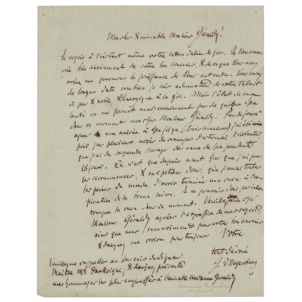 ALS in French, signed “G. Meyerbeer,†one page, 7.75 x 10, no date. Lengthy untranslated handwritten letter to M. Geraldy. In fine condition.