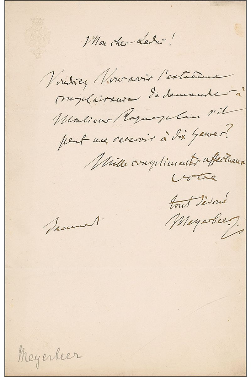 ALS in French, signed “Meyerbeer,” one page, 5.25 x 8.25, no date. Letter asking for an appointment with the painter Camille Roqueplan. In fine condition, with scattered light toning and soiling, mainly to the edges, and pencil notation to lower left.