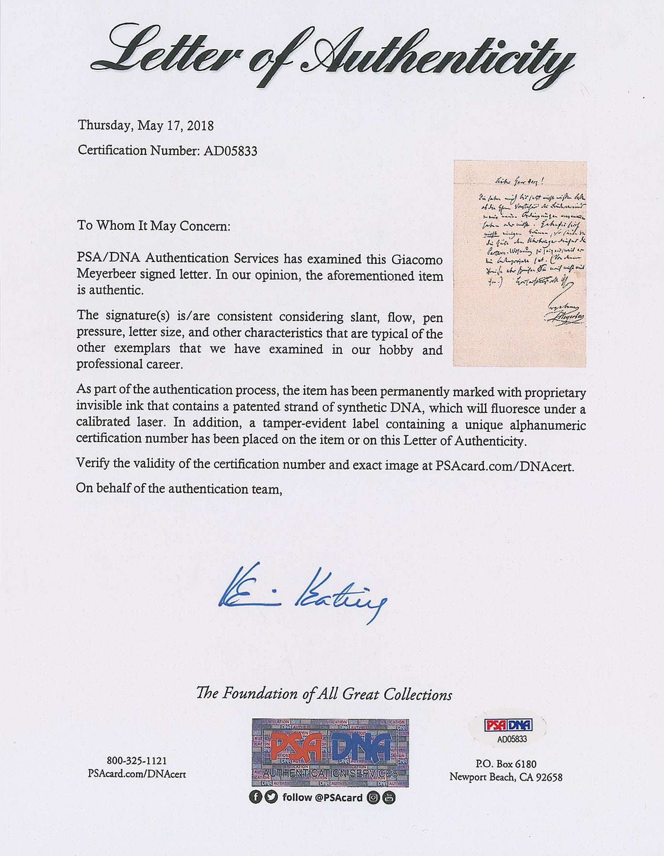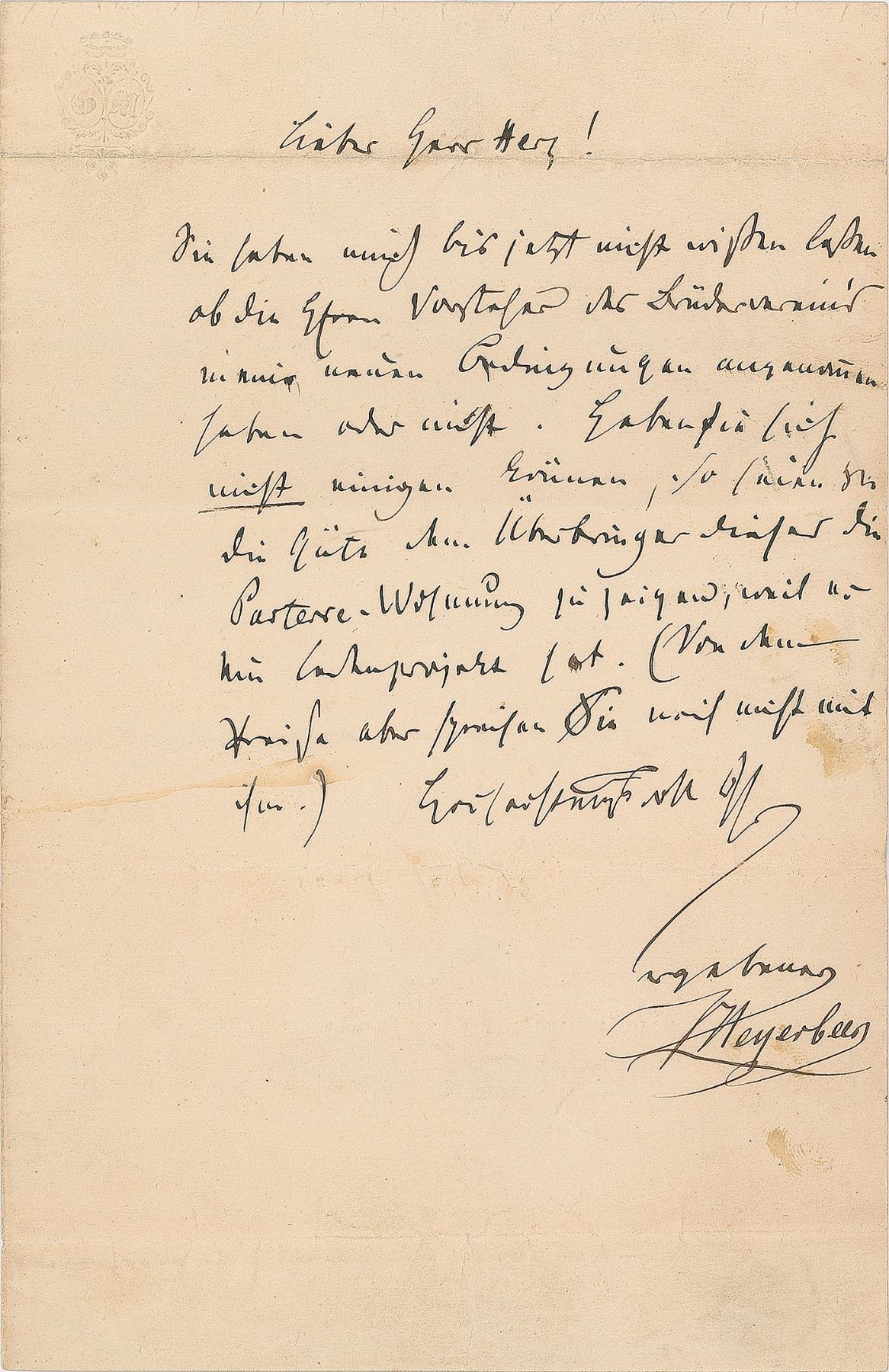 German-born composer (1791–1864) best known for such operas as Les Hugenots and Robert le diable. ALS in German, signed “Meyerbeer,” one page, 5.25 x 8, no date. Letter to Mr. Herz, in full (translated): "You haven't informed me as of yet whether the Messr. leaders of the Brother club agree to my new terms or not. If they have not reached a consensus, be so kind as to show the bearer of this the ground-floor apartment, because he has [my] teaching project. (Please don't speak to him about the price yet, though)." In very good to fine condition, with several horizontal folds and a few light stains. Accompanied by a full letter of authenticity from PSA/DNA.