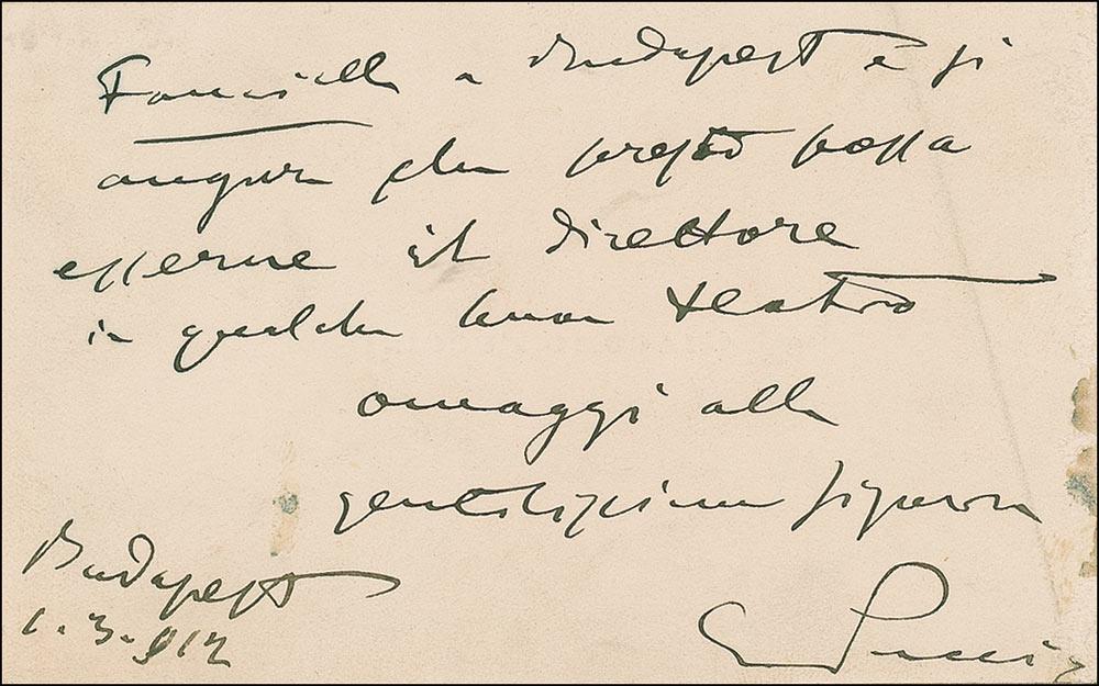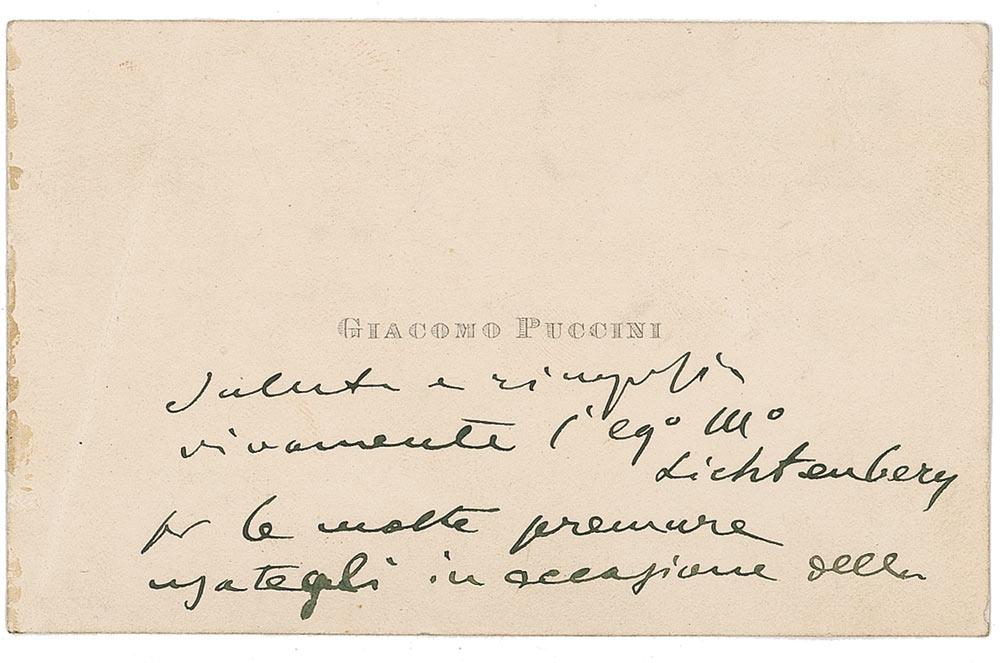 Italian composer (1858–1924) who earned a central place in the operatic pantheon with such repertoire staples as ‘La boheme,’ ‘Madama Butterfly,’ and ‘Tosca.’ ALS in Italian, signed “G. Puccini,” on both sides of one of his 4.25 x 2.75 visiting cards, January 3, 1912. Letter to Mr. Lichtenberg about his opera Fanciula del West. Translated in full: “Sends his regards and warmly thanks the distinguished Maestro Lichtenberg for the many courtesies extended to him in the occasion of the…[his opera]…Fanciulla [del West] in Budapest with the wish that soon he may become the director in some good theatre. Best regards to your very kind wife.” In very good to fine condition, with scattered light soiling and edge staining, a couple of diagonal creases, one lightly affecting end of signature, and some minor surface loss to right edge, lightly affecting end of signature.