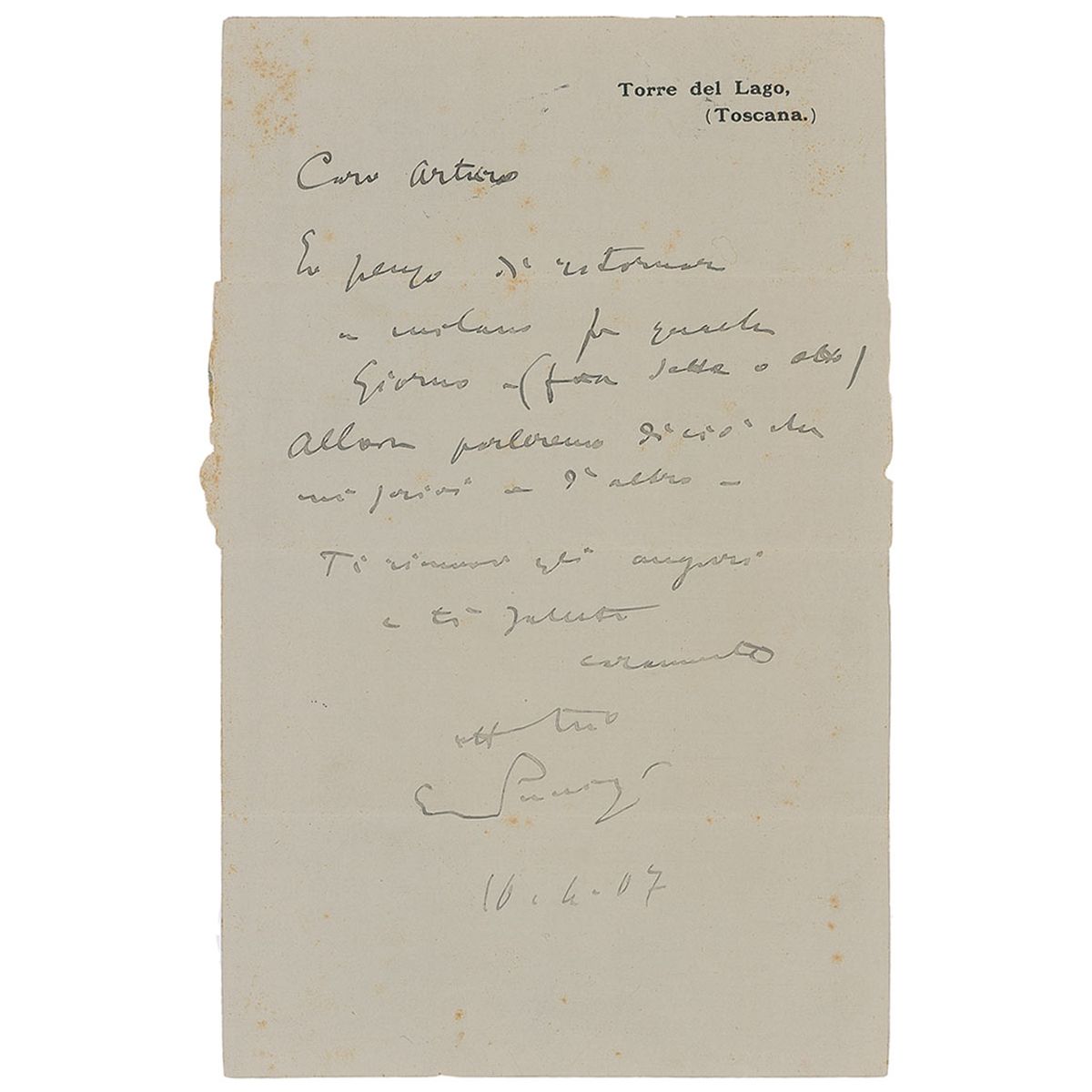 Brief ALS in Italian, one page, Torre del Lago letterhead, 6 x 9.75, October 6, 1907. In a quick letter, possibly addressed to Arturo Toscanini, principal conductor at La Scala in Milan during this time period, Puccini writers, in full: “I am thinking of returning to Milan for a few days (perhaps seven or eight). Then we will speak of what you wrote to me and other things.” In very good condition, with three horizontal folds, minor paper loss to the right edge, and moderate scattered foxing.  In the fall of 1907, Puccini would finally come to settle on the theme for his first opera since the wildly successful release of Madame Butterfly to Brescia audiences in 1904. This next endeavor would focus on Belasco’s play, La Fanciulla del West (Girl of the West), a play Puccini and his wife, Elvira, saw while visiting New York in 1906. This letter, dated at the time of Puccini’s long-awaited decision, could very well reference the announcement of his anticipated operatic idea.