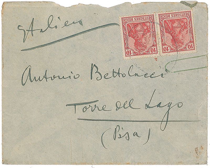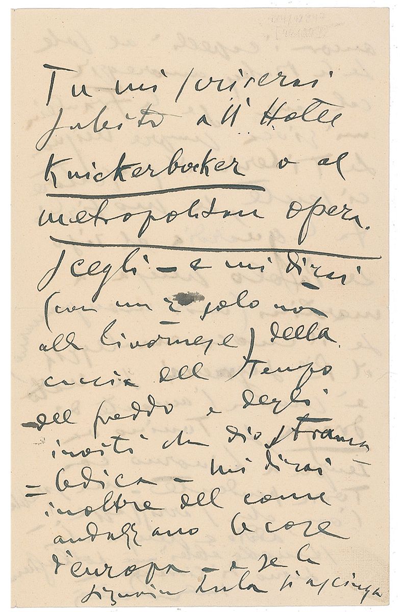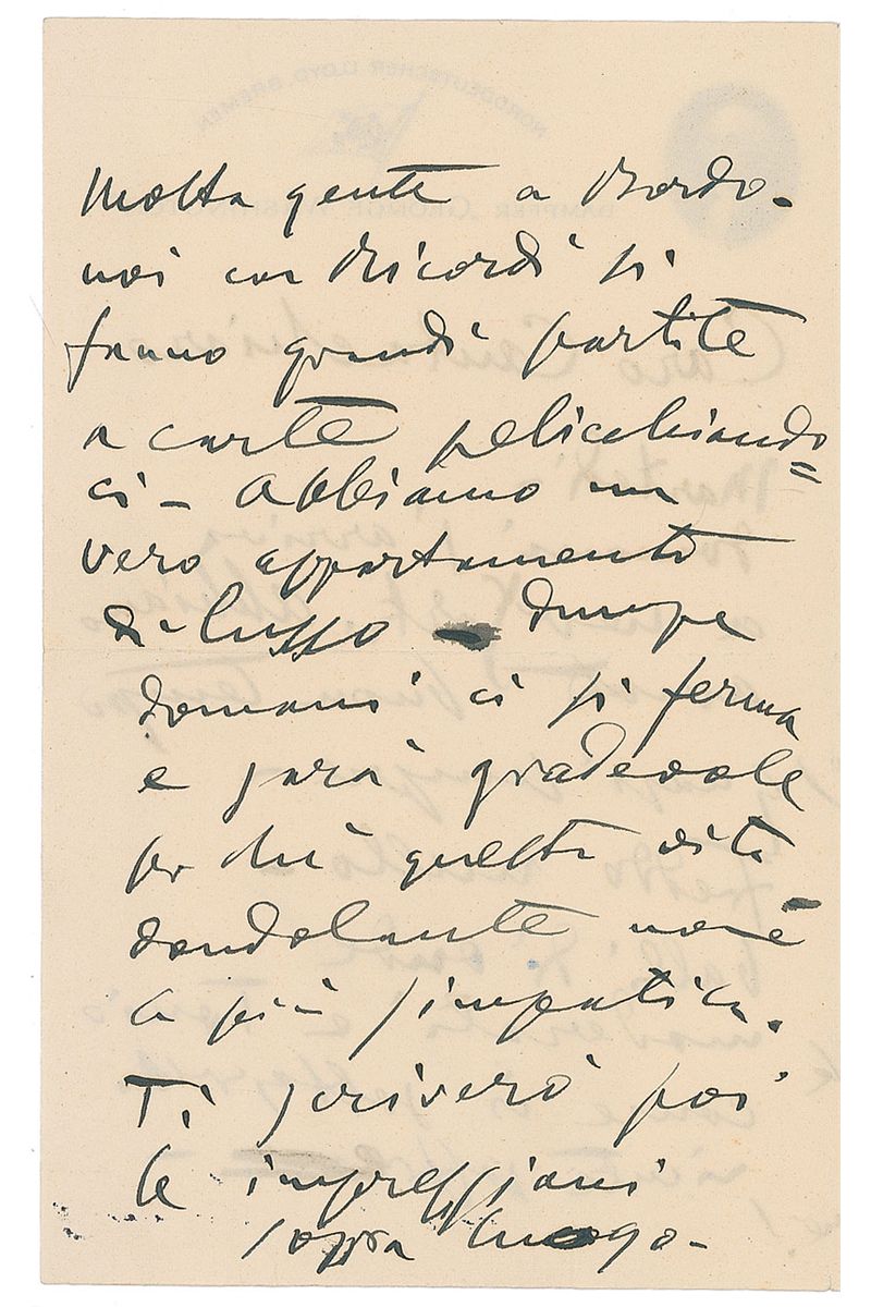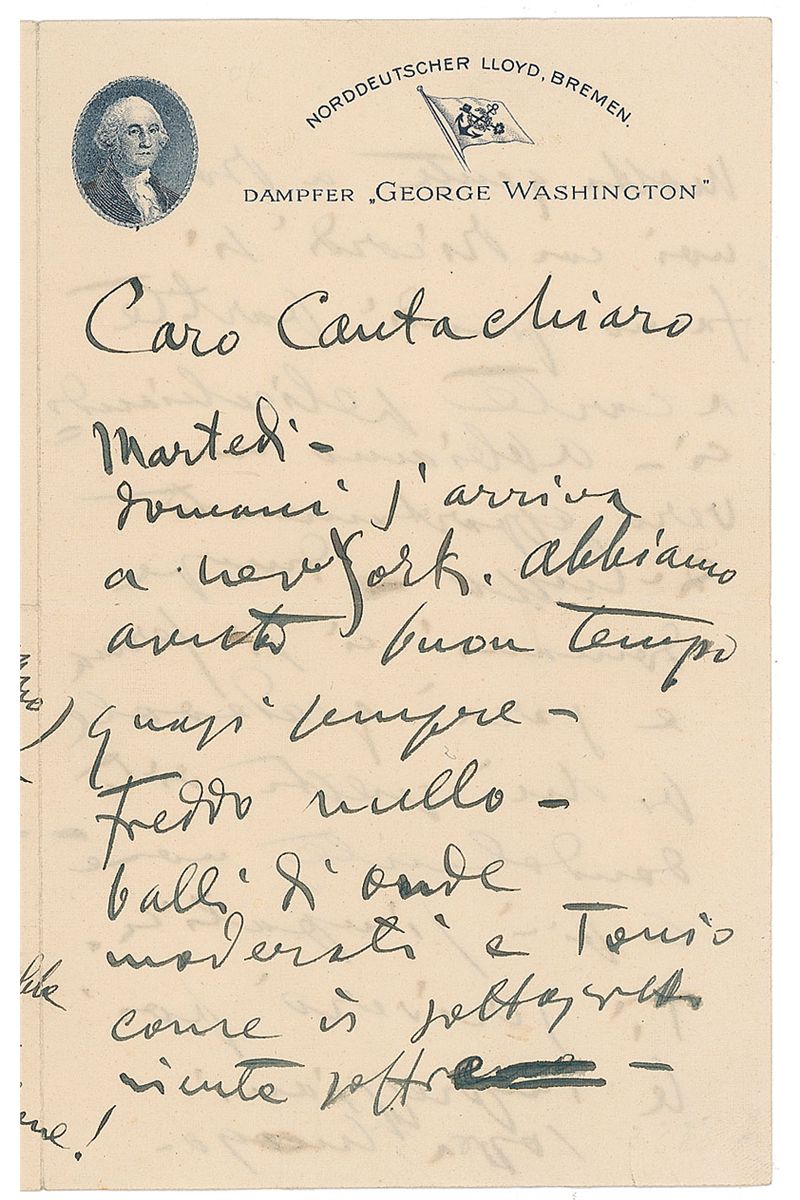 Italian composer (1858–1924) who earned a central place in the operatic pantheon with such repertoire staples as ‘La boheme,’ ‘Madama Butterfly,’ and ‘Tosca.’ ALS in Italian, four pages on two adjoining sheets, 4.5 x 7, George Washington letterhead, no date. Untranslated letter, written on board the George Washington, while on his way to New York for the first presentation of La Fanciulla del West at the Metropolitan Opera. In fine condition, with some light show-through from writing on opposite sides. Accompanied by the original mailing envelope.