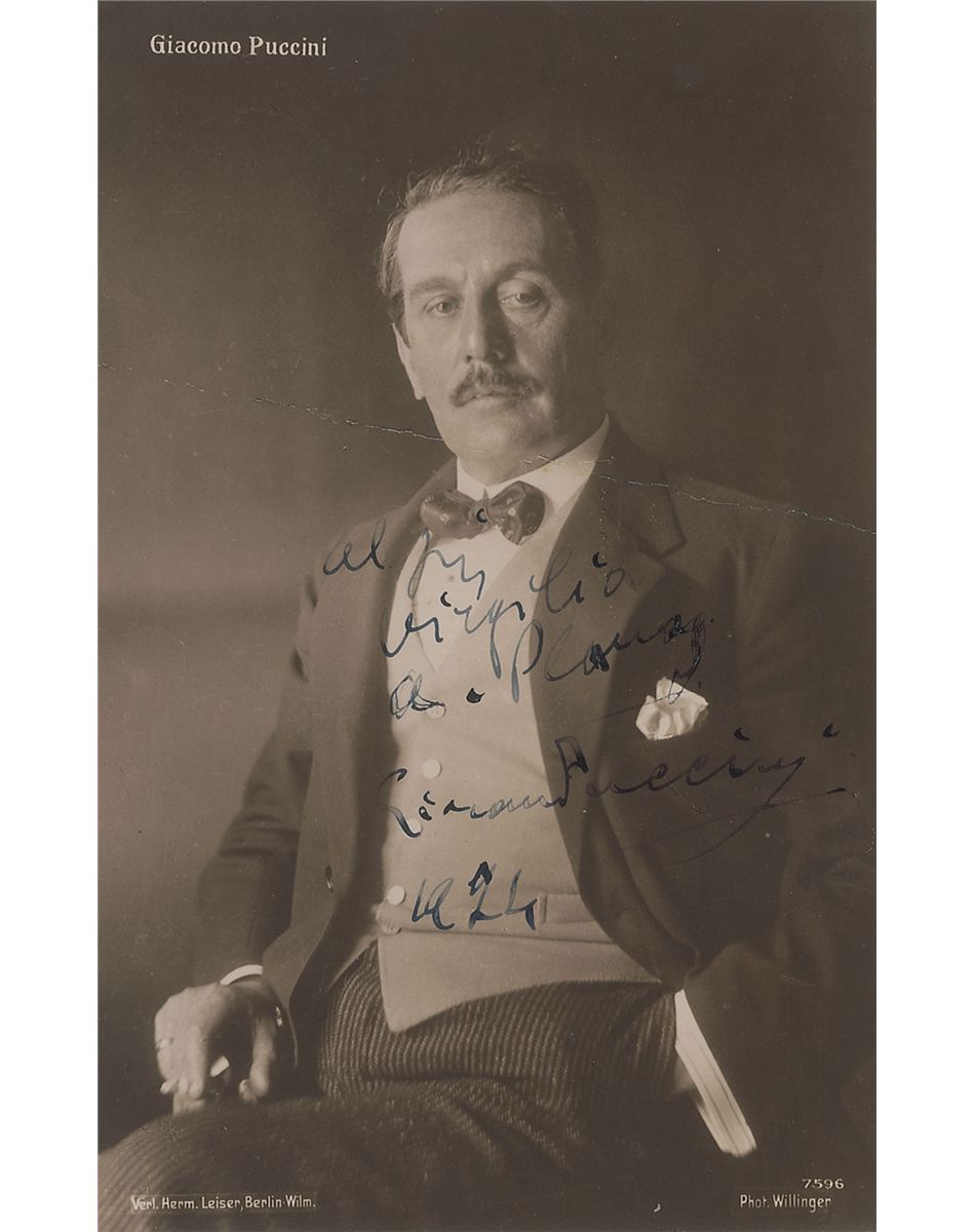 Sharp matte-finish 3.5 x 5.25 real photo postcard of Puccini holding an ominous cigarette, signed and inscribed in Italian in fountain pen, and dated 1924. A diagonal crease passing through his neck and a bit of light contrast to portions of the inscription and signature against the dark background, otherwise fine condition. This must have been signed just shortly before his death in November 1924, when he passed away from complications after radiation therapy treatment for his recently discovered throat cancer—as shown here, Puccini was a chain smoker of Toscano cigars and cigarettes throughout his life. An appropriate yet somber photograph of the distinguished composer.