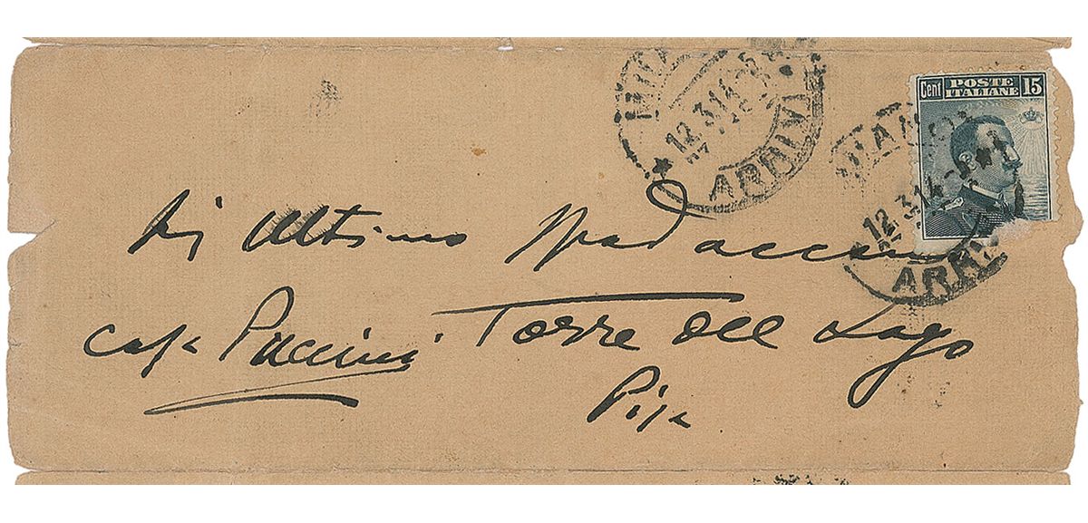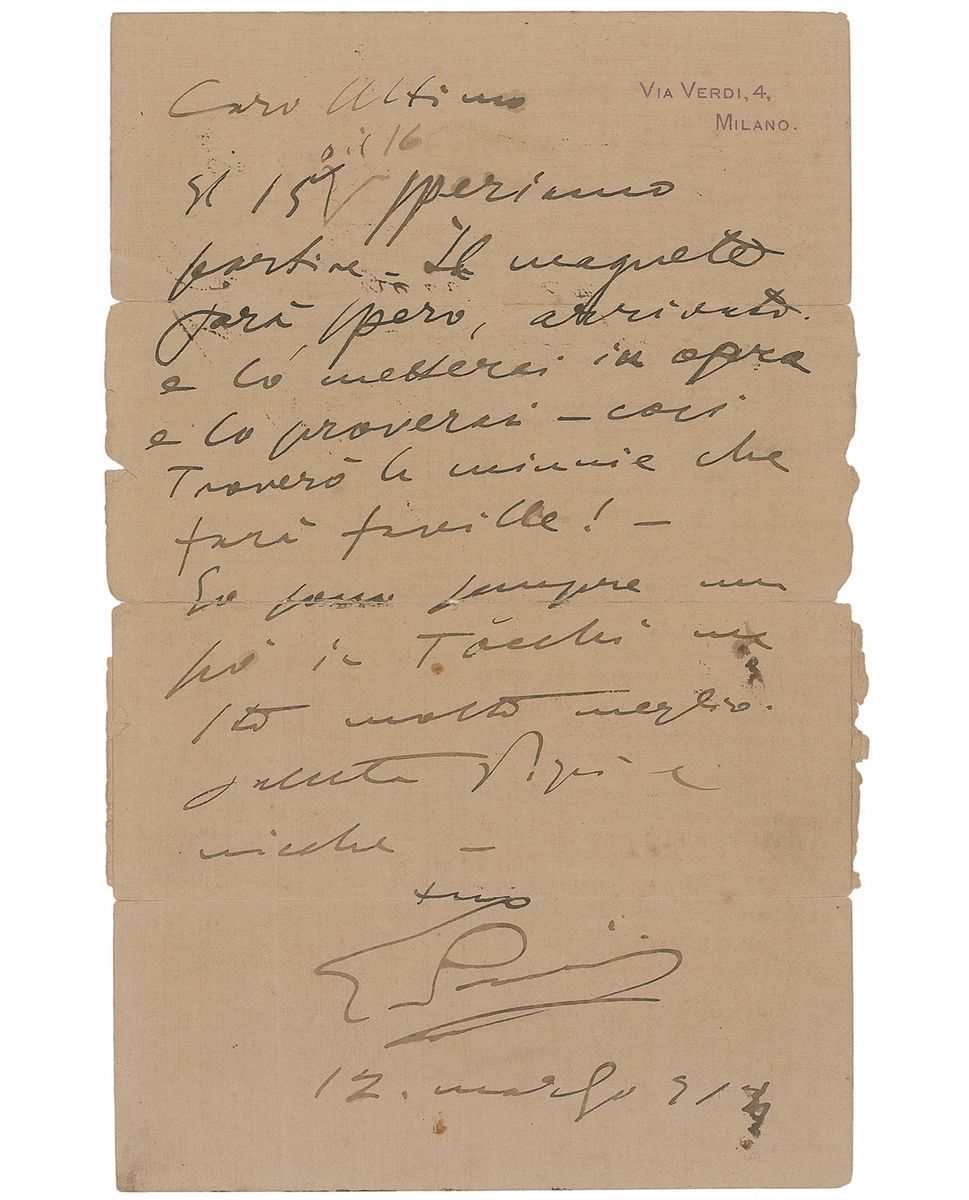 ALS in Italian, signed “G. Puccini,” one page, 6 x 9.75, May 12, 1891. Untranslated letter written before the performance of his opera Edgar in Lucca, addressed to a friend of the composer in Torre del Lago. In very good condition, with partial separations to mailing folds, small edge tears, and overall toning.